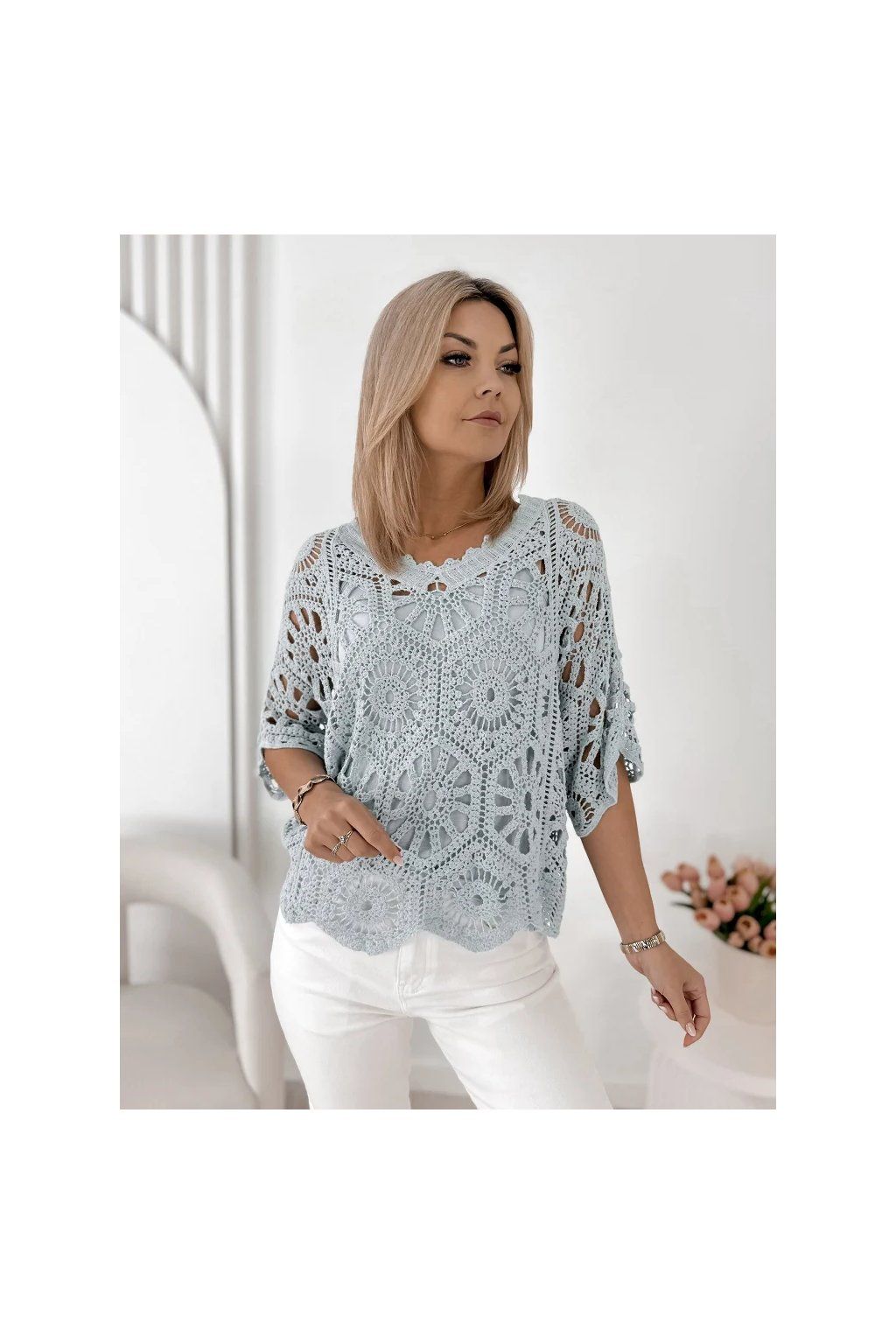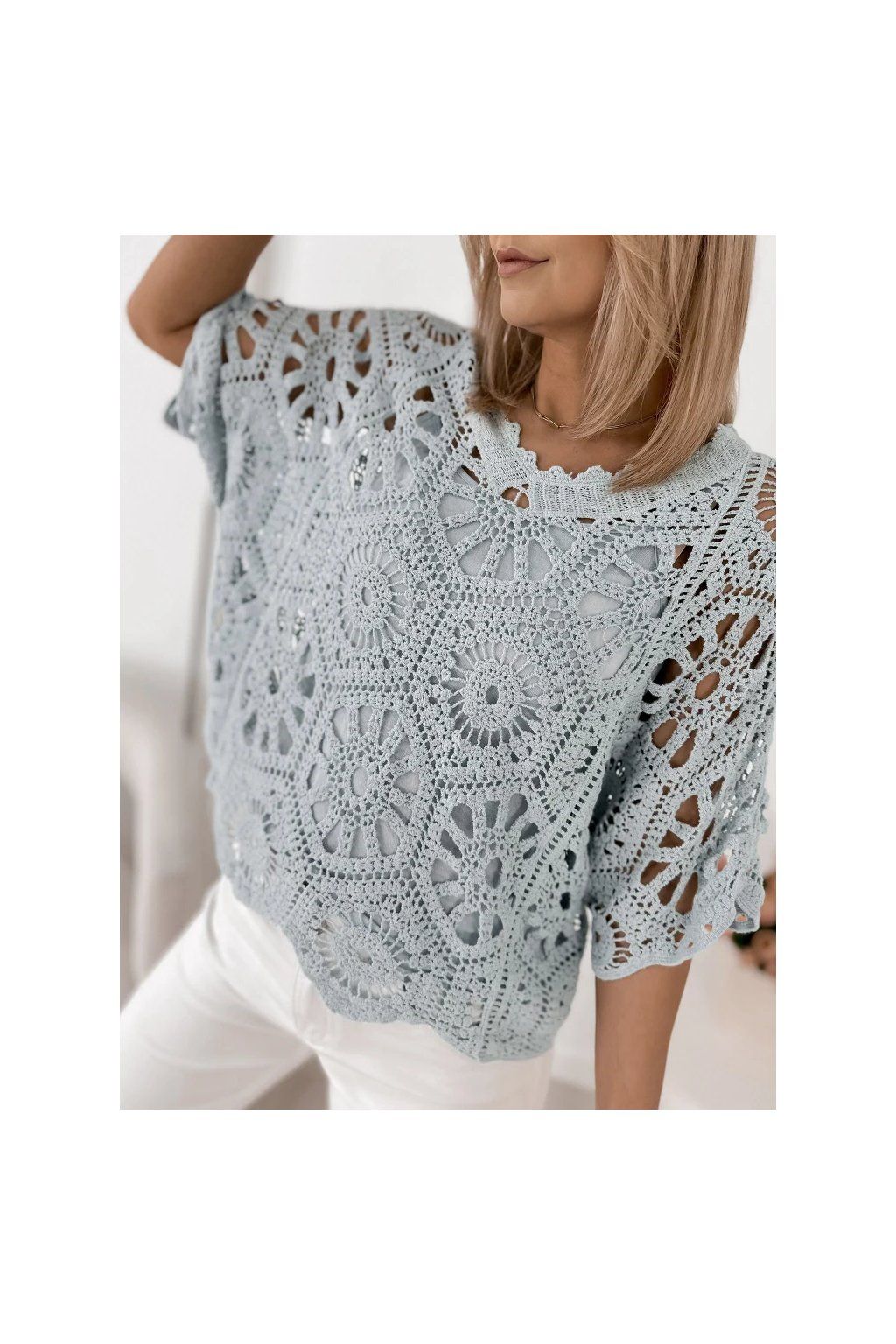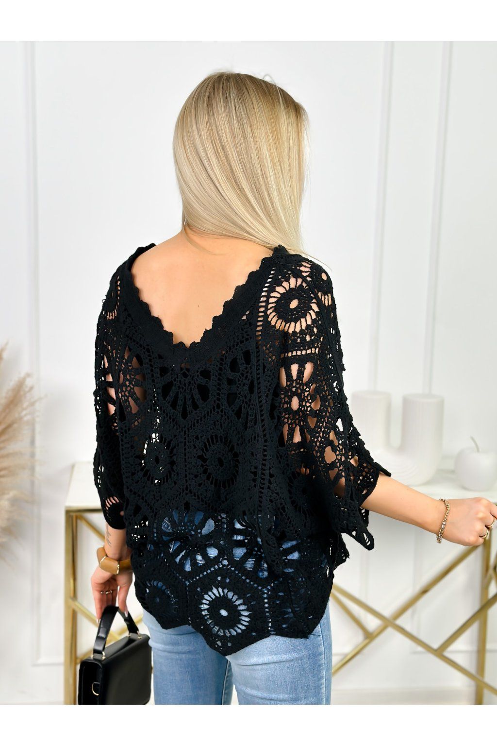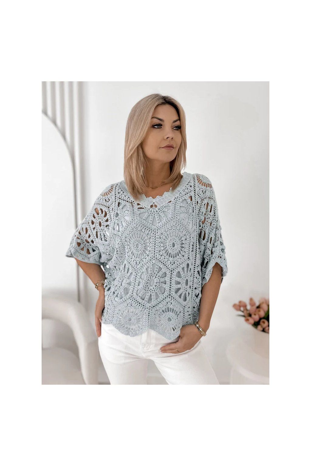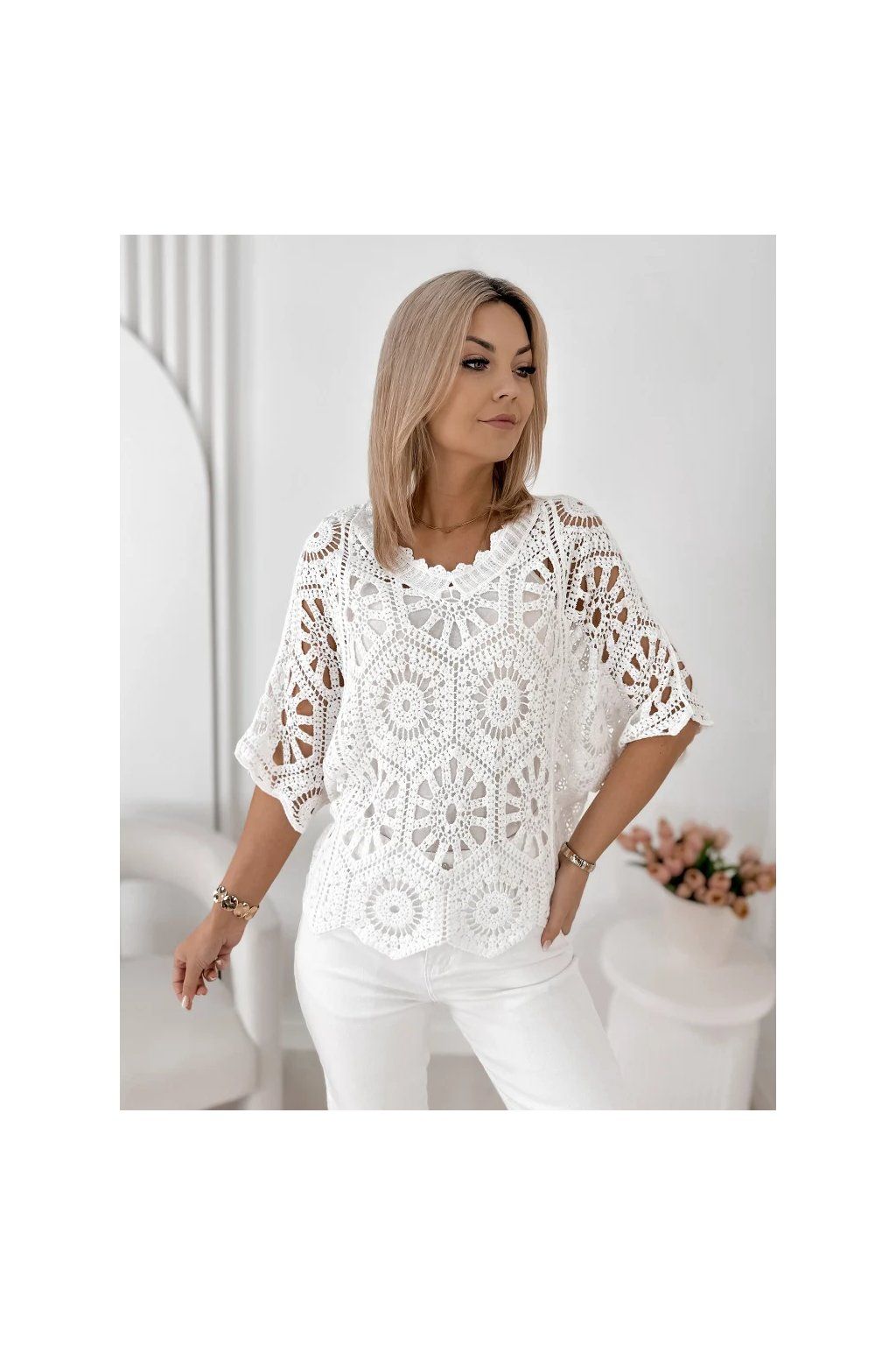Jemná krajková struktura dodává halence romantický a sofistikovaný vzhled, zatímco volný střih zajišťuje maximální pohodlí a krásně se přizpůsobí každé postavě. Výstřih do „V“ opticky prodlužuje siluetu a dodává ženskost.