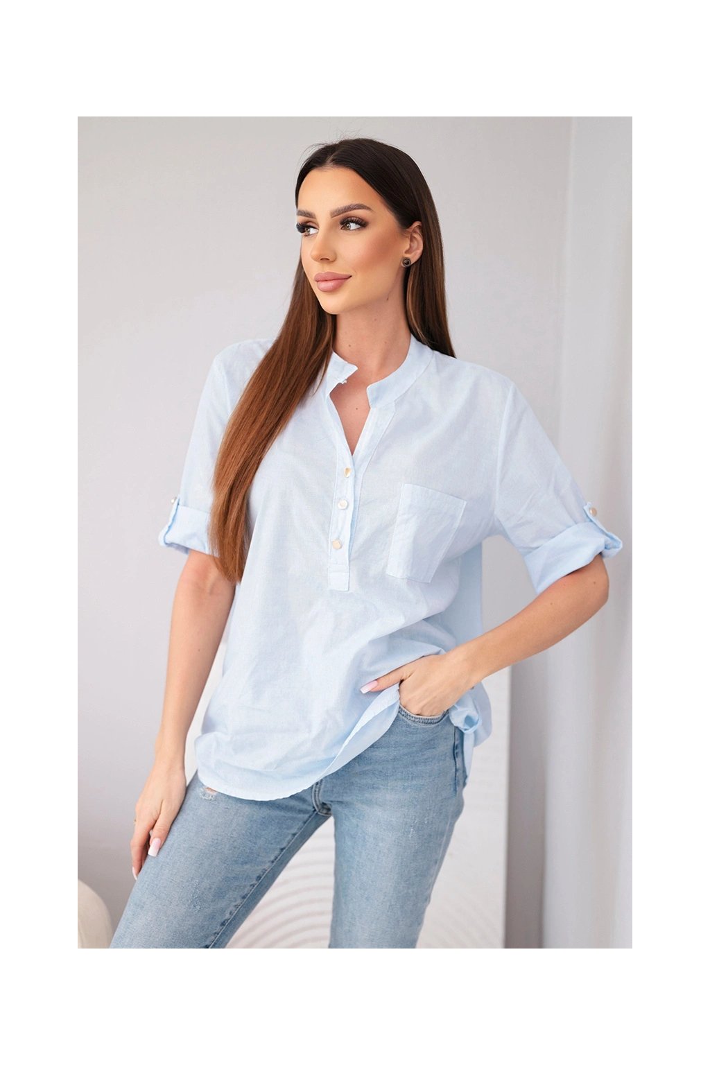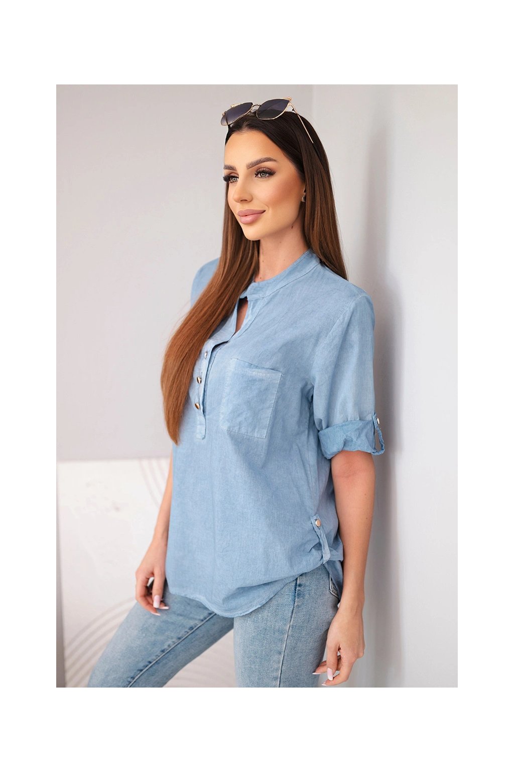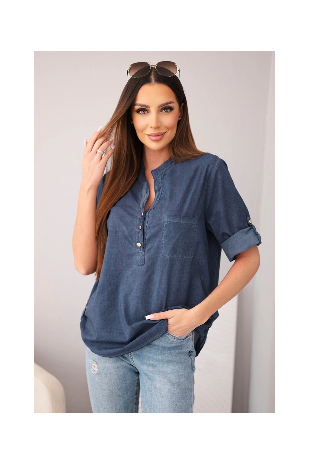 Model zaujme okrúhlym výstrihom s krátkym zapínaním na gombíky, ktorý dodáva elegantný, no zároveň ležérny vzhľad. Praktické vrecko na hrudi a rukávy s možnosťou vyhrnutia podčiarkujú moderný štýl.