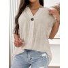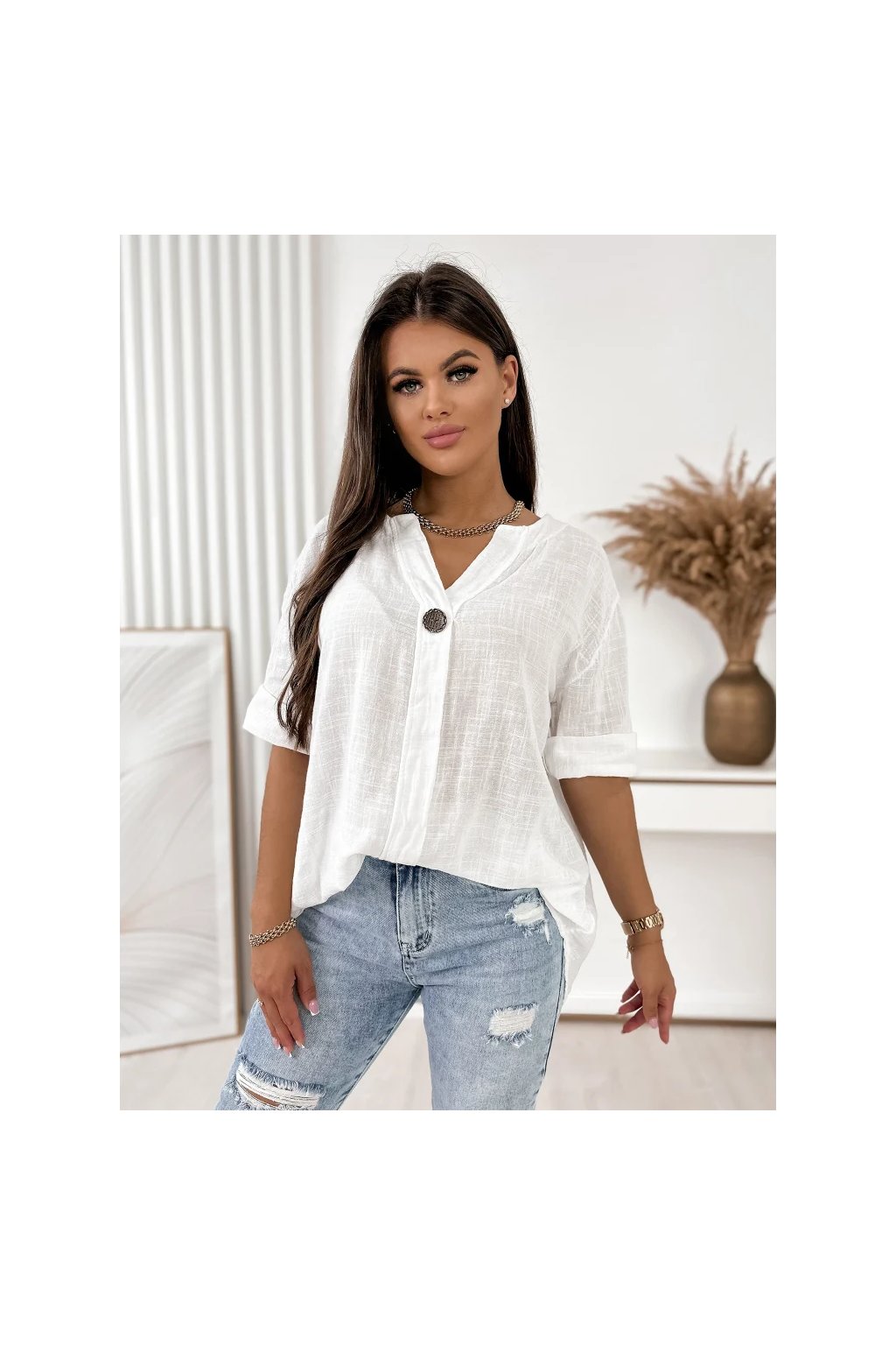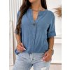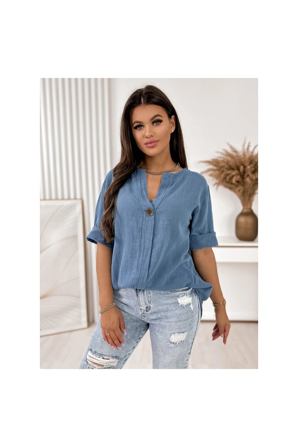 Elegantný výstrih do V opticky predlžuje siluetu a ozdobný gombík dodáva modelu moderný detail. Krátke rukávy s ohrnutím podčiarkujú ležérny mestský štýl.