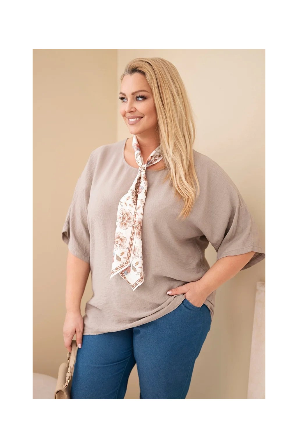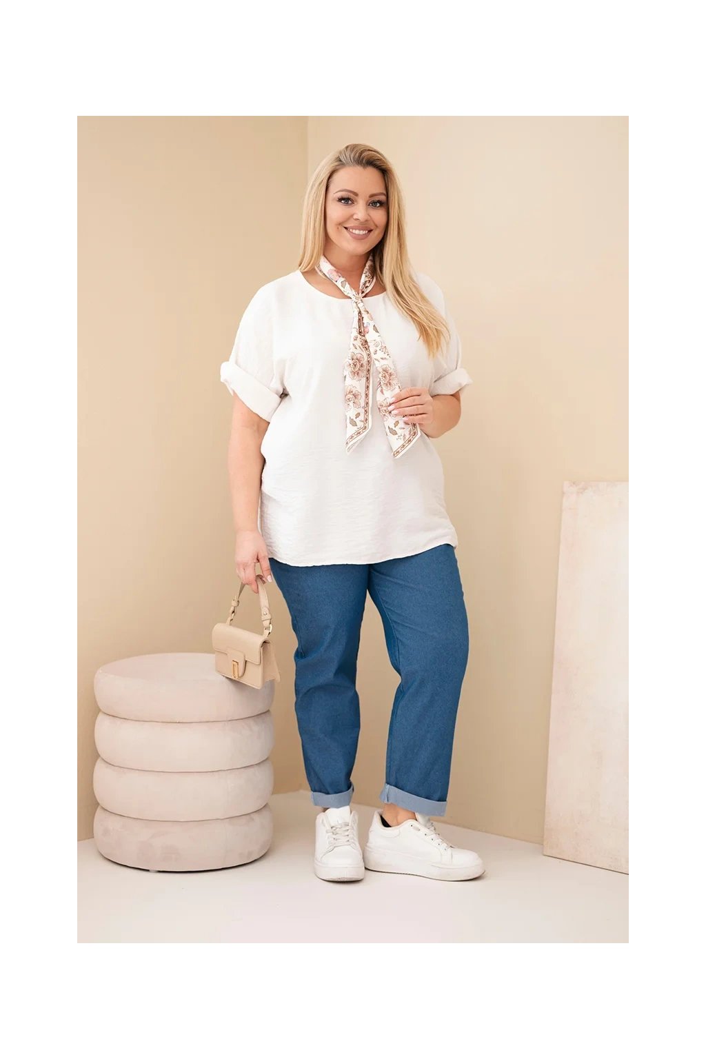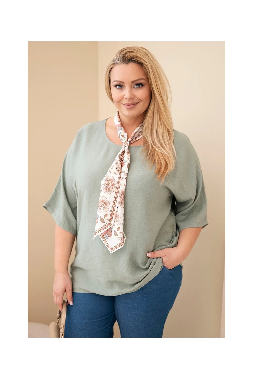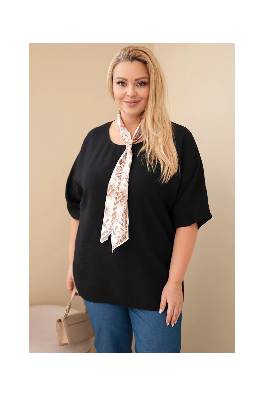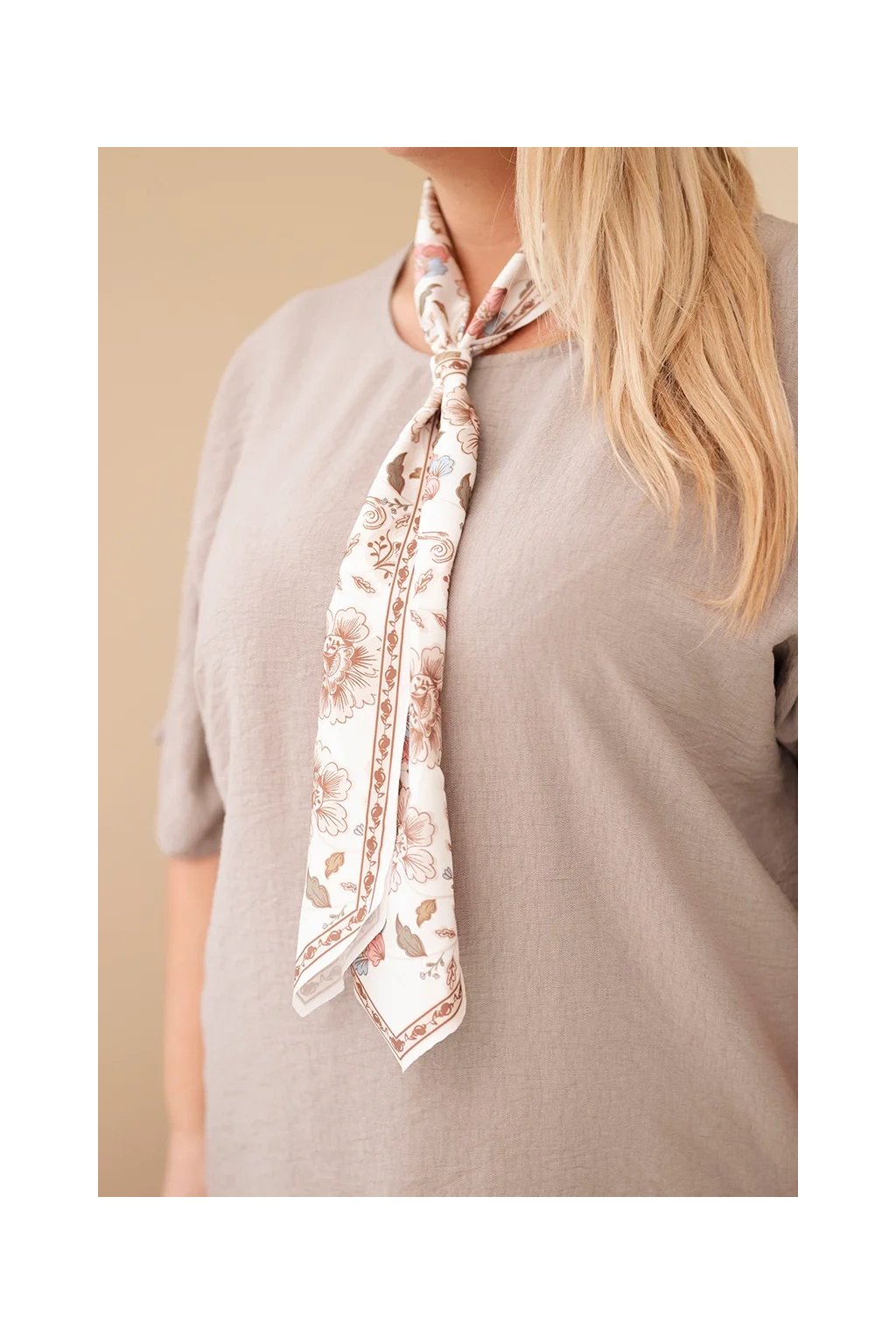 Dominantným prvkom je ozdobná šatka s jemným kvetinovým vzorom, ktorá dodáva blúzke ženský a elegantný vzhľad. Môžete ju štýlovo uviazať okolo krku a vytvoriť tak moderný detail.