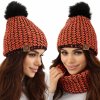 Elegantný a hrejivý dámsky set čiapky a nákrčníka z hustého, nadýchaného úpletu s vysokým podielom vlny. Moderný vzor, sýte farby a čierny brmbolec dodávajú setu štýlový vzhľad.