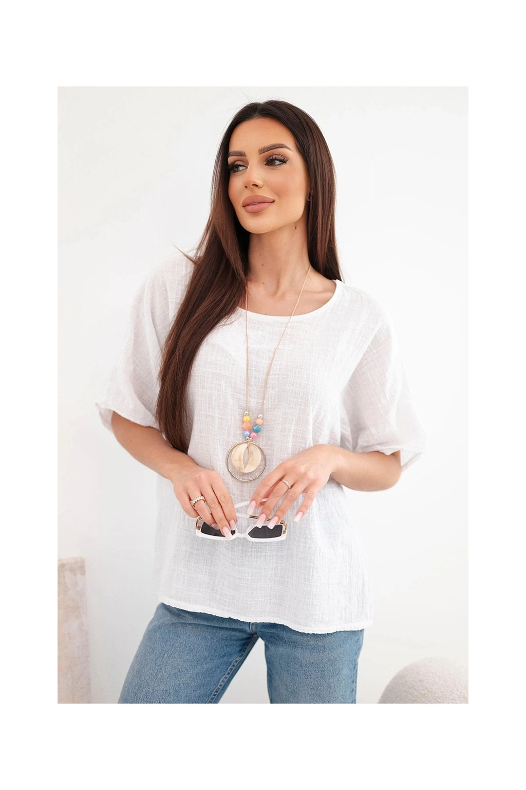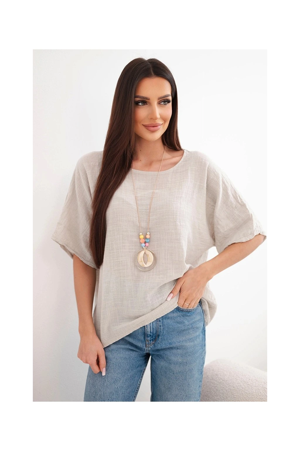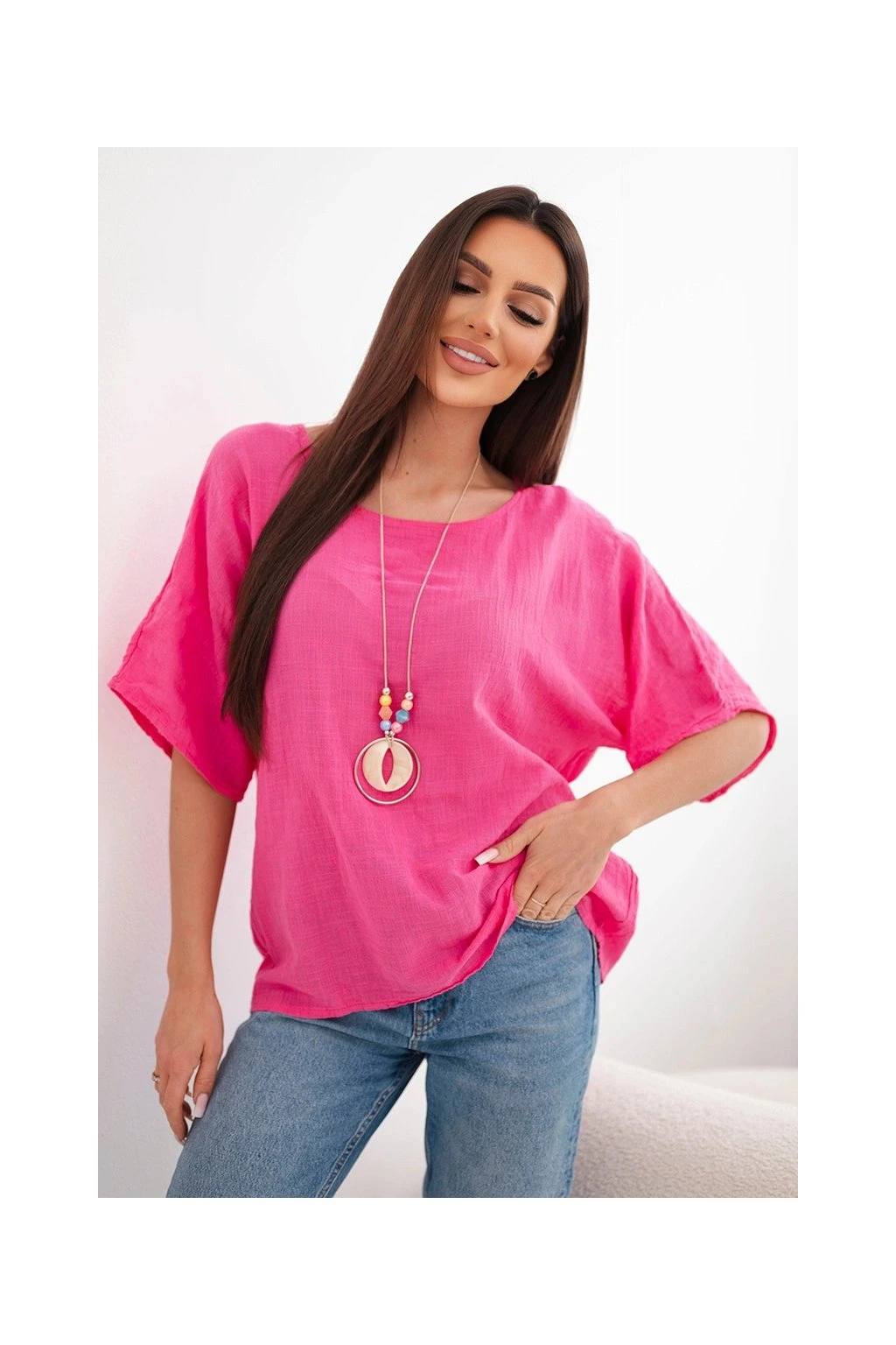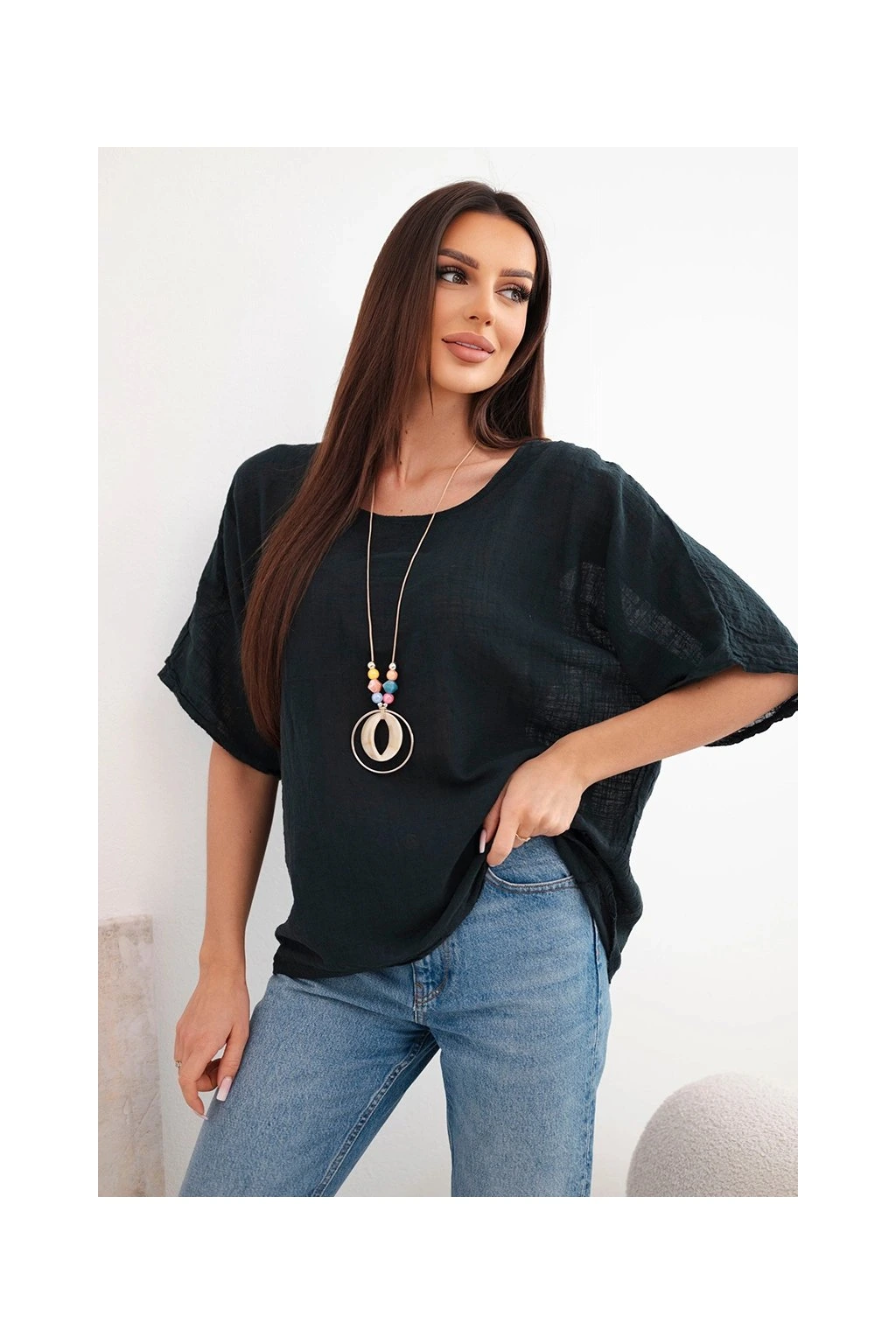 Fantastická Talianska oversize blúzka s príveskom je spojením ležérnosti a jemnej elegancie. Táto blúzka je vyrobená z príjemného a mäkkého materiálu a poskytuje výnimočné pohodlie pri nosení. Blúzka nevyžaduje žehlenie.