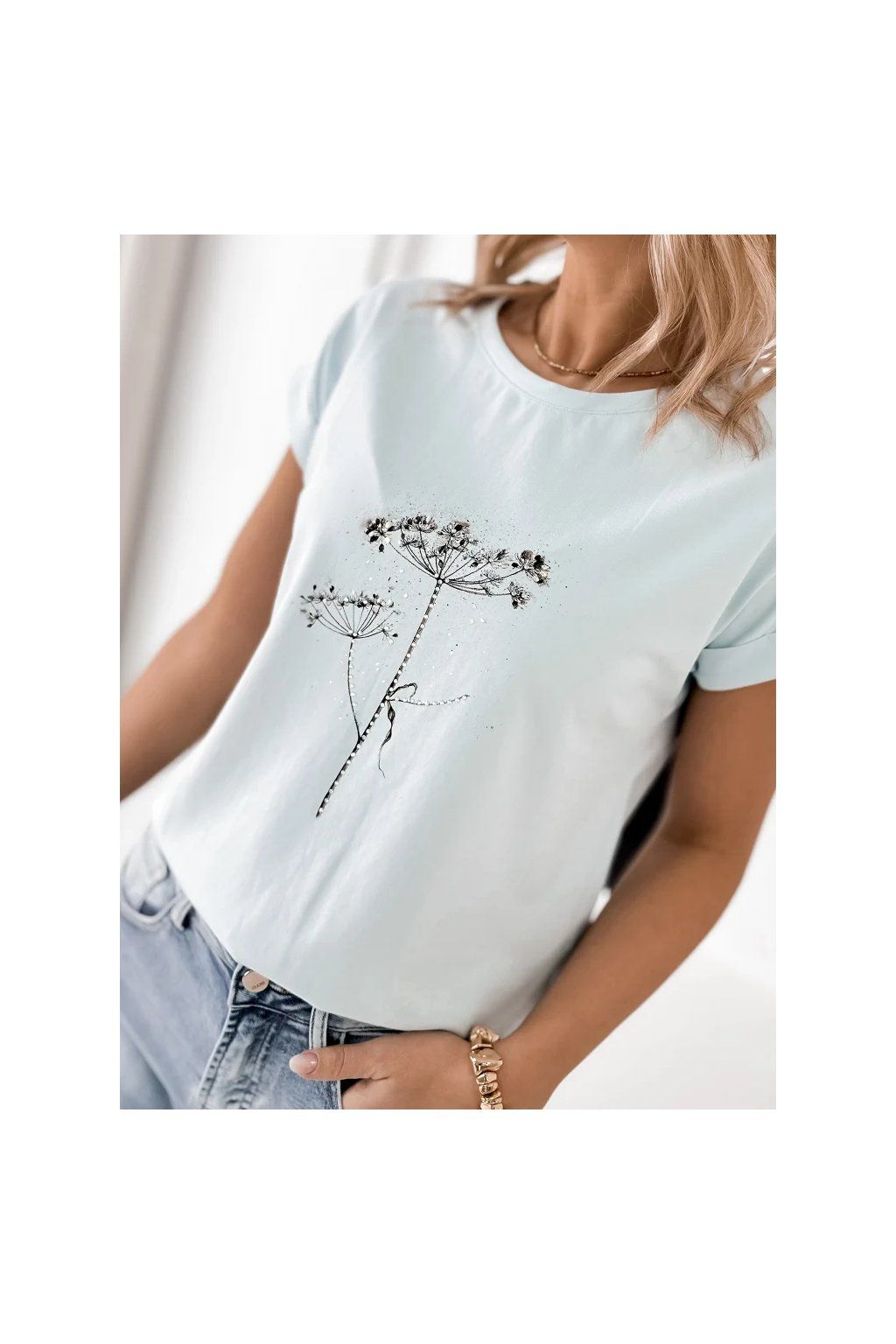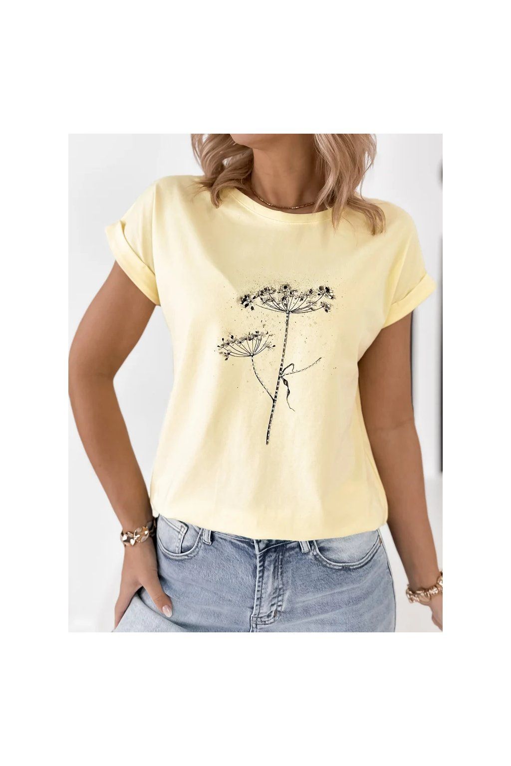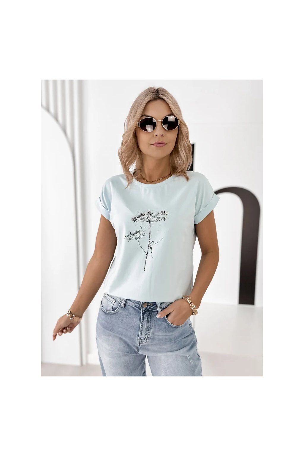 Model zaujme jemnou potlačou s kvetinovým motívom, ktorá pôsobí elegantne a nadčasovo. Krátke rukávy a klasický okrúhly výstrih robia z trička univerzálny kúsok vhodný do každého šatníka.