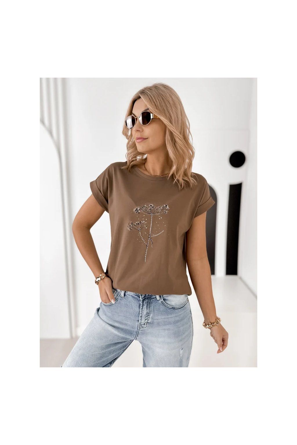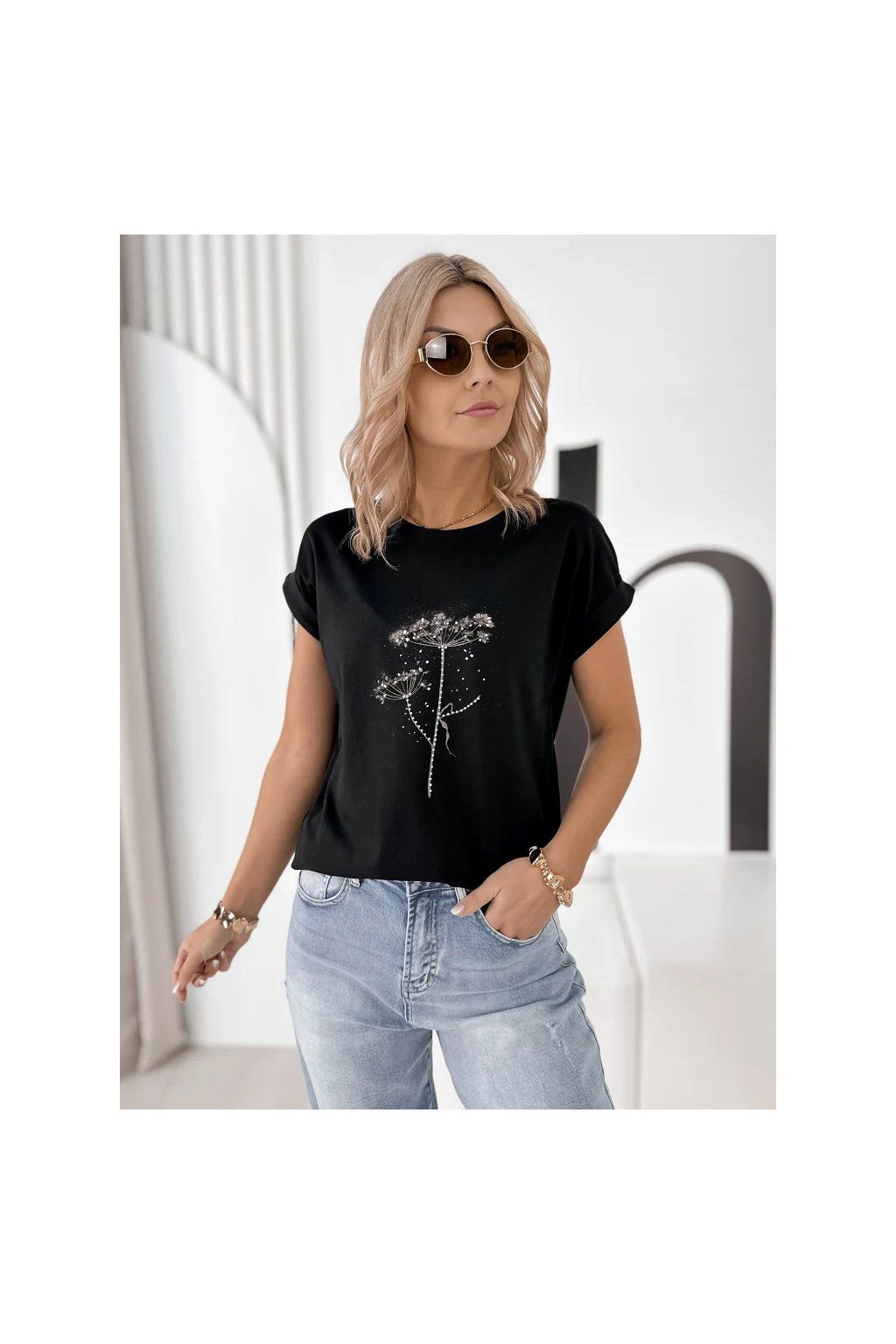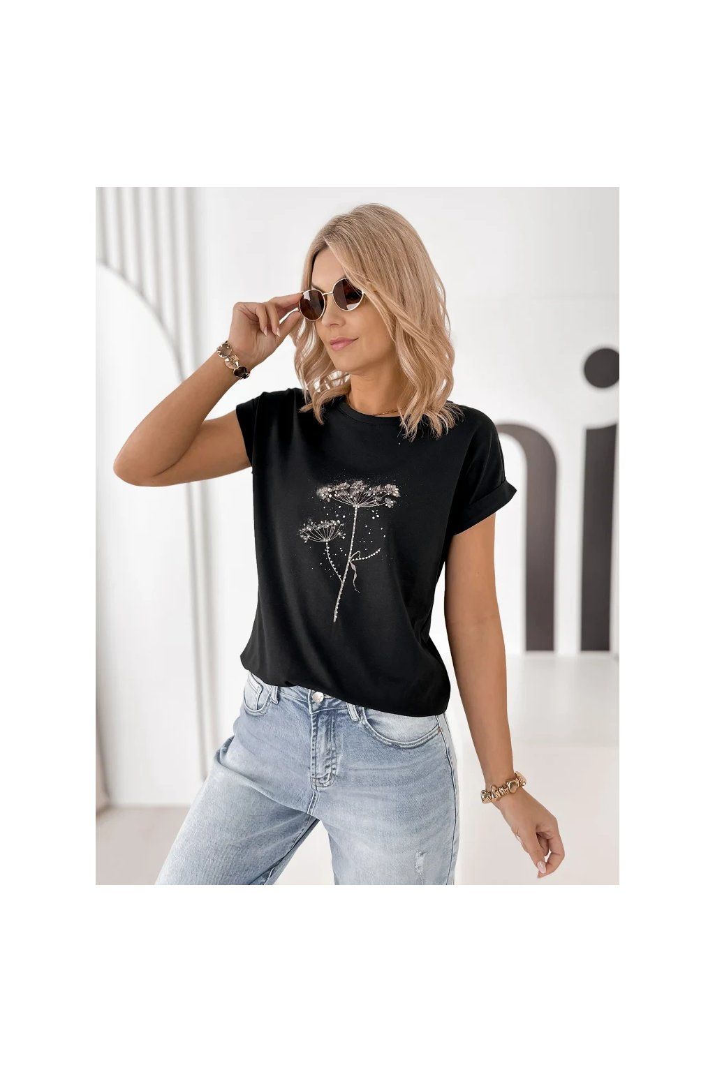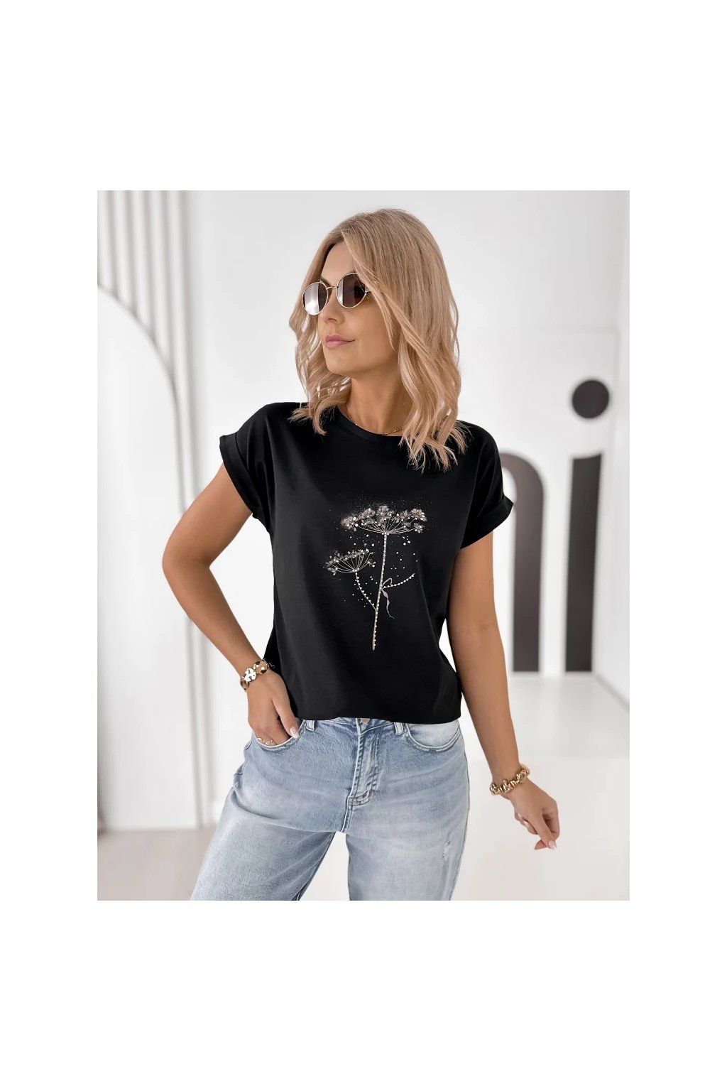Model zaujme jemnou potlačou s kvetinovým motívom, ktorá pôsobí elegantne a nadčasovo. Krátke rukávy a klasický okrúhly výstrih robia z trička univerzálny kúsok vhodný do každého šatníka.