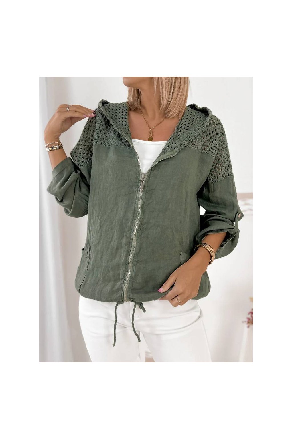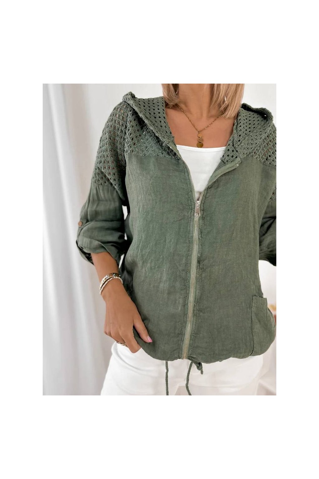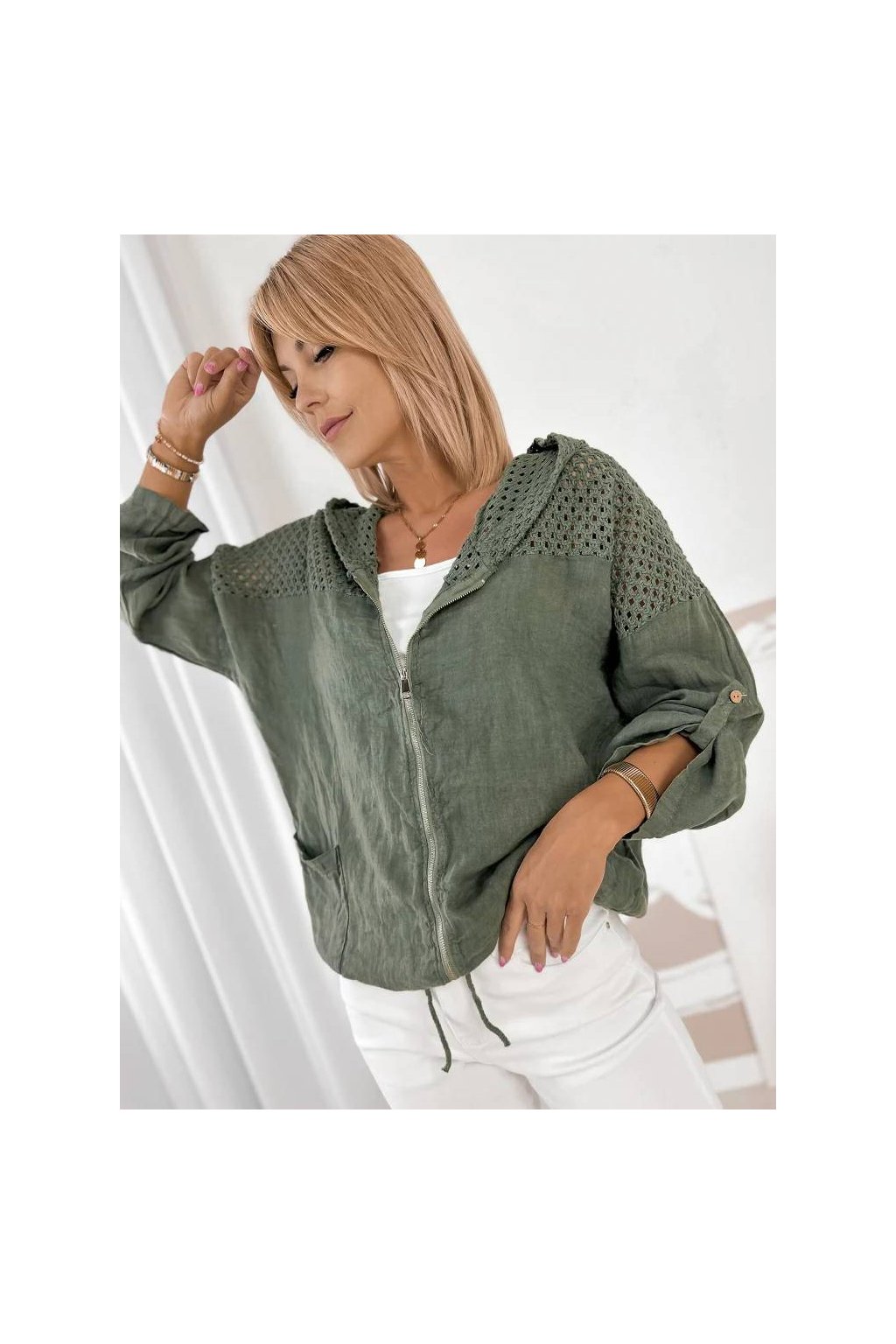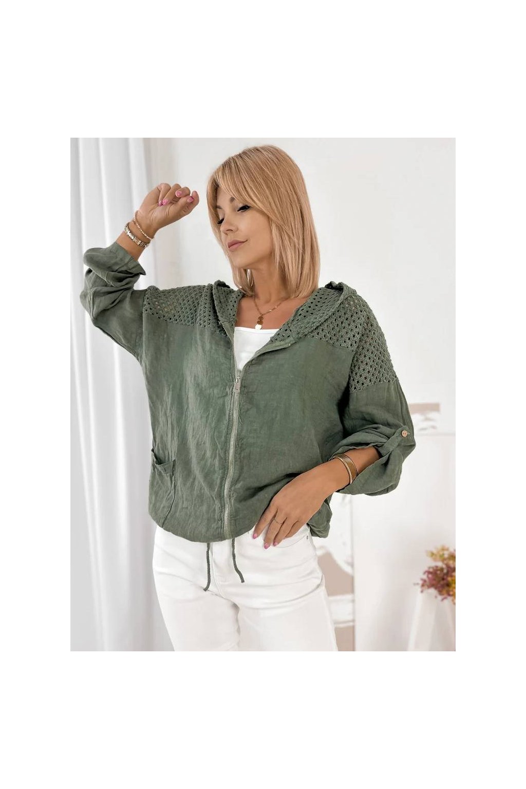 Dámska ľanová mikina s kapucňou na zips – khaki
