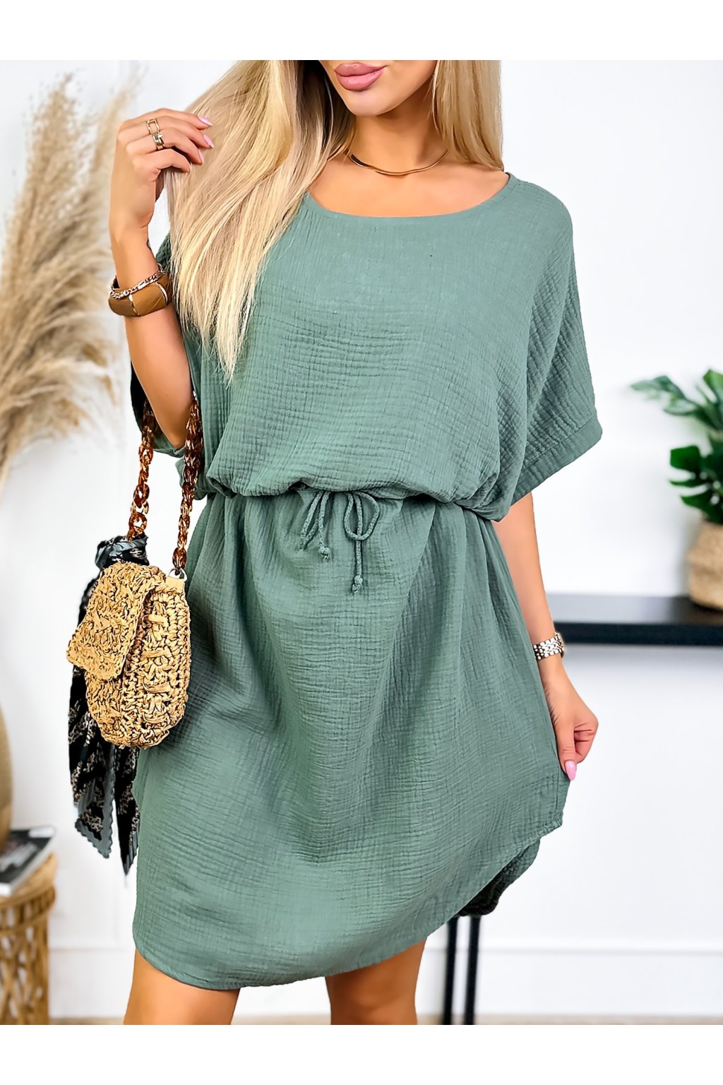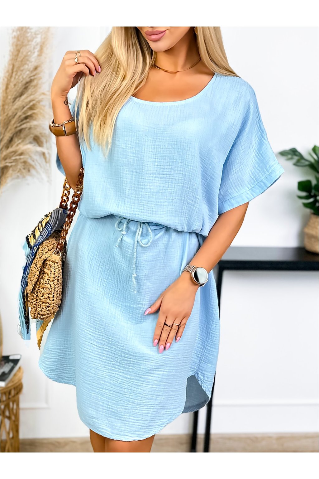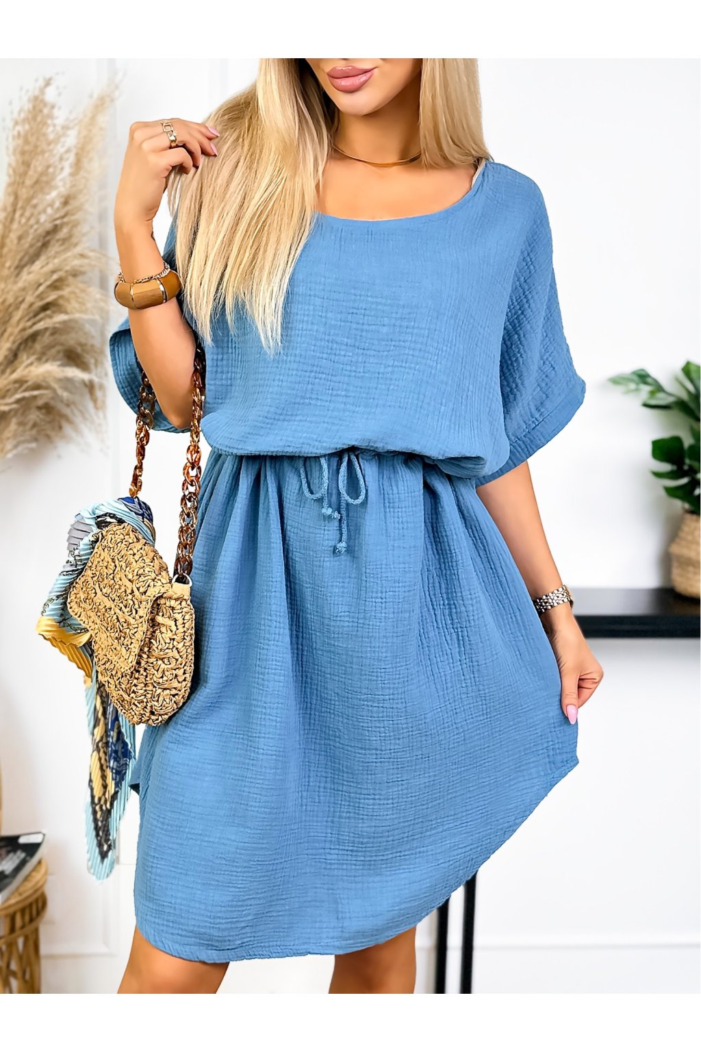 Tieto mušelínové šaty sú ideálne na letné outfity. Sú vyrobené z pohodlnej bavlny, majú klasický okrúhly výstrih a voľné krátke rukávy. Nastaviteľný pás zaisťuje perfektné padnutie a zvýrazňuje vašu postavu.