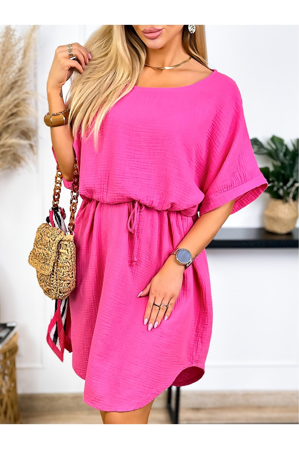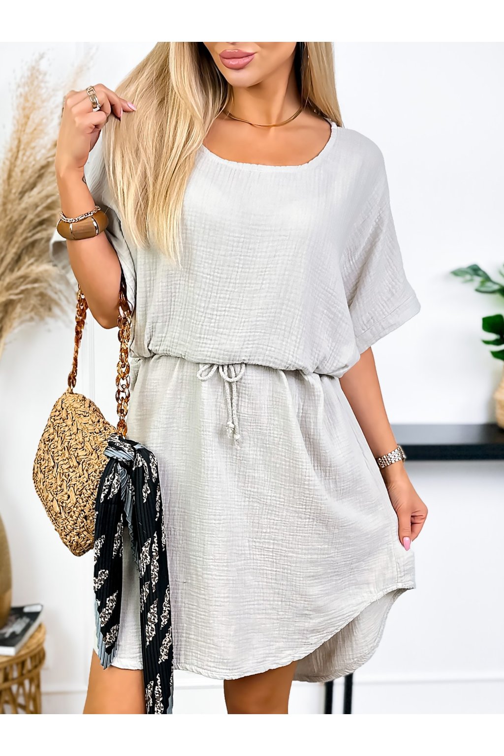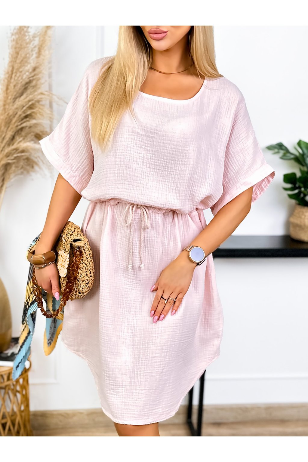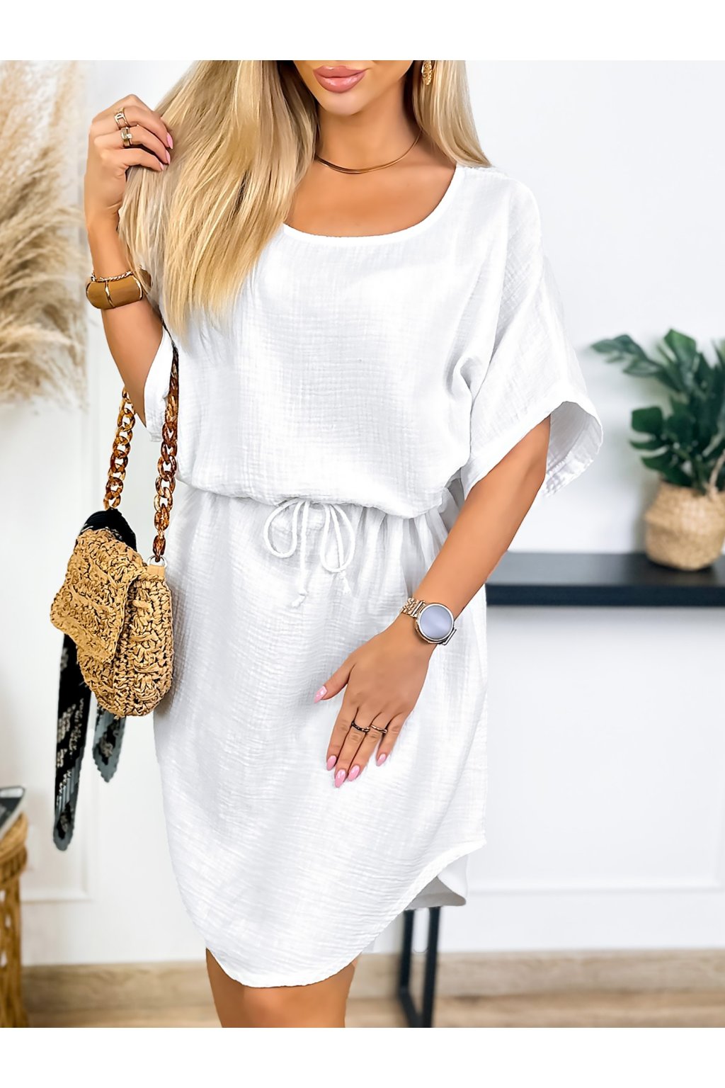 Tieto mušelínové šaty sú ideálne na letné outfity. Sú vyrobené z pohodlnej bavlny, majú klasický okrúhly výstrih a voľné krátke rukávy. Nastaviteľný pás zaisťuje perfektné padnutie a zvýrazňuje vašu postavu.