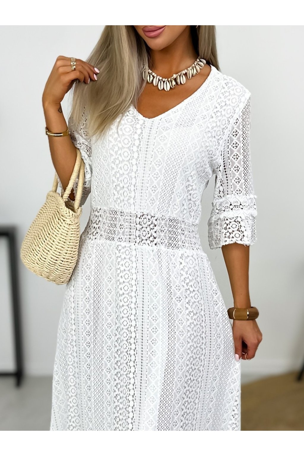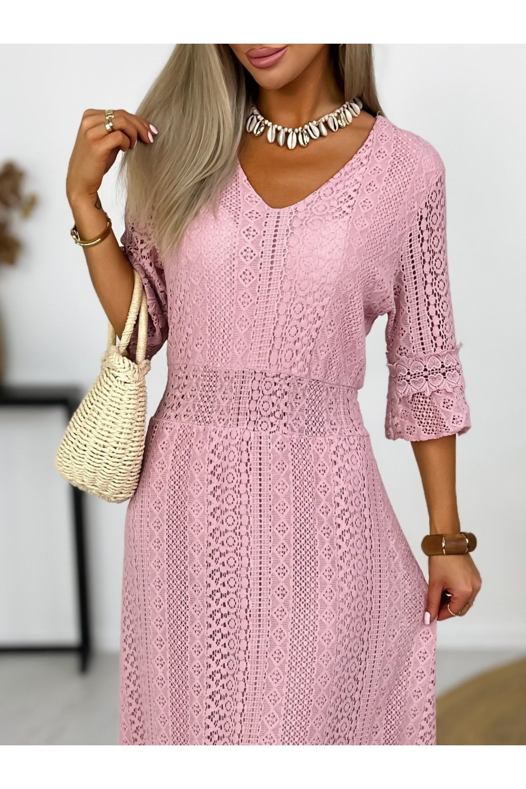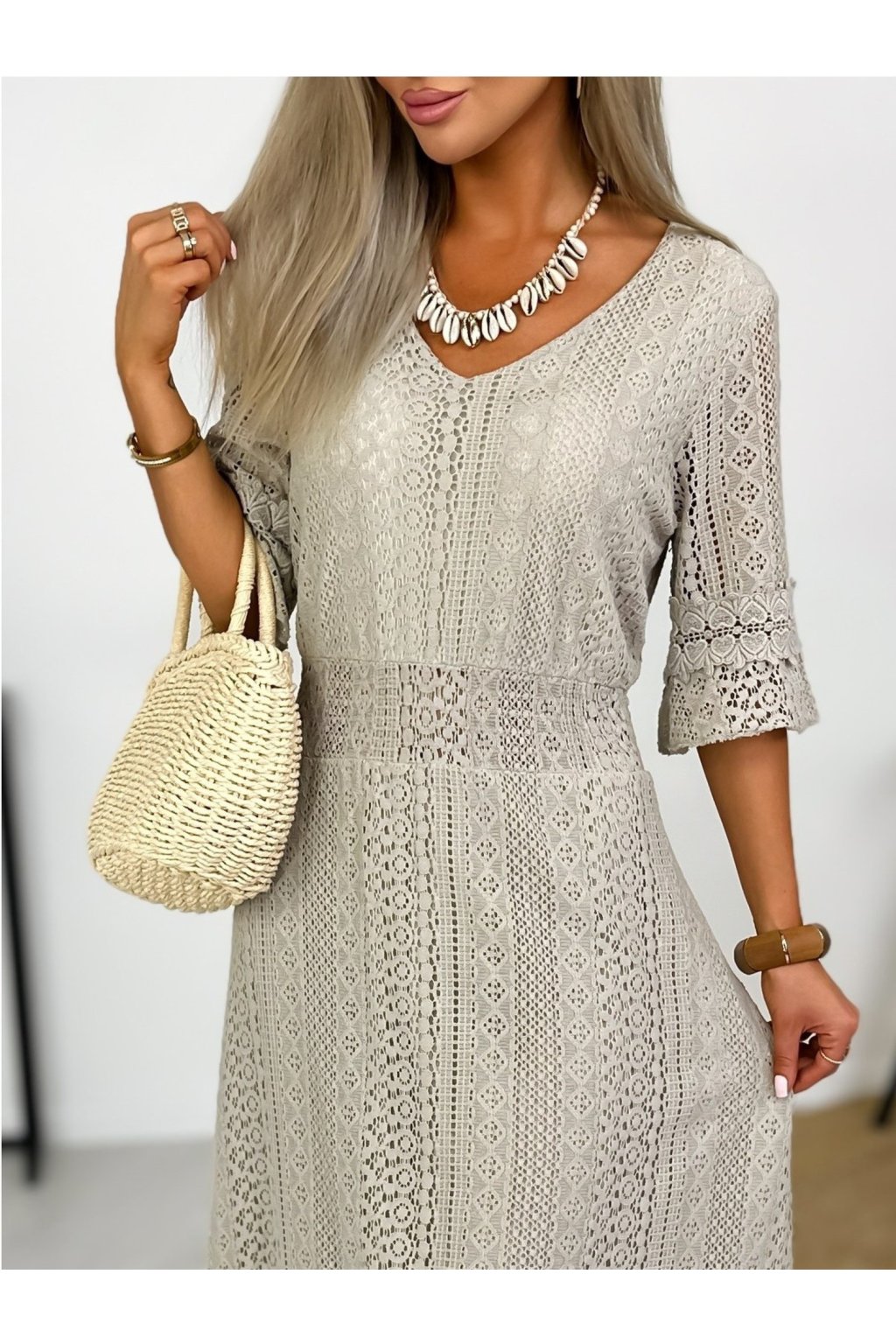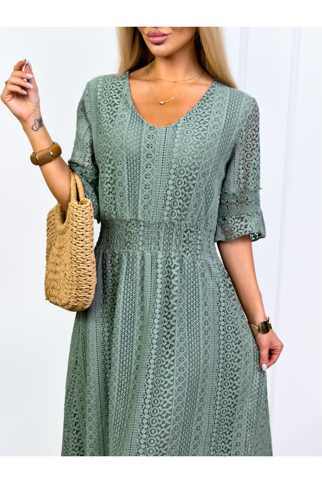 Krásne čipkované šaty s 3/4 rukávmi. Podšité výstrihom do V a elastickým pásom. Jemné krajkové šaty sú stelesnením vycibrené a veľmi ženskej módy, ktorá sa ľahko nosí a skvele vyzerá. Navyše patrí medzi top trendy tohtoročnej sezóny, takže pokiaľ ste sa s nimi ešte nezoznámili, je najvyšší čas.