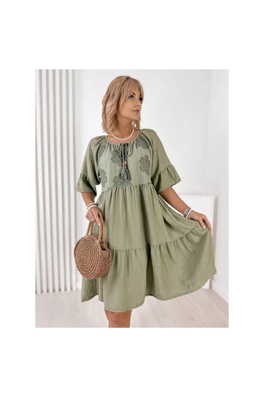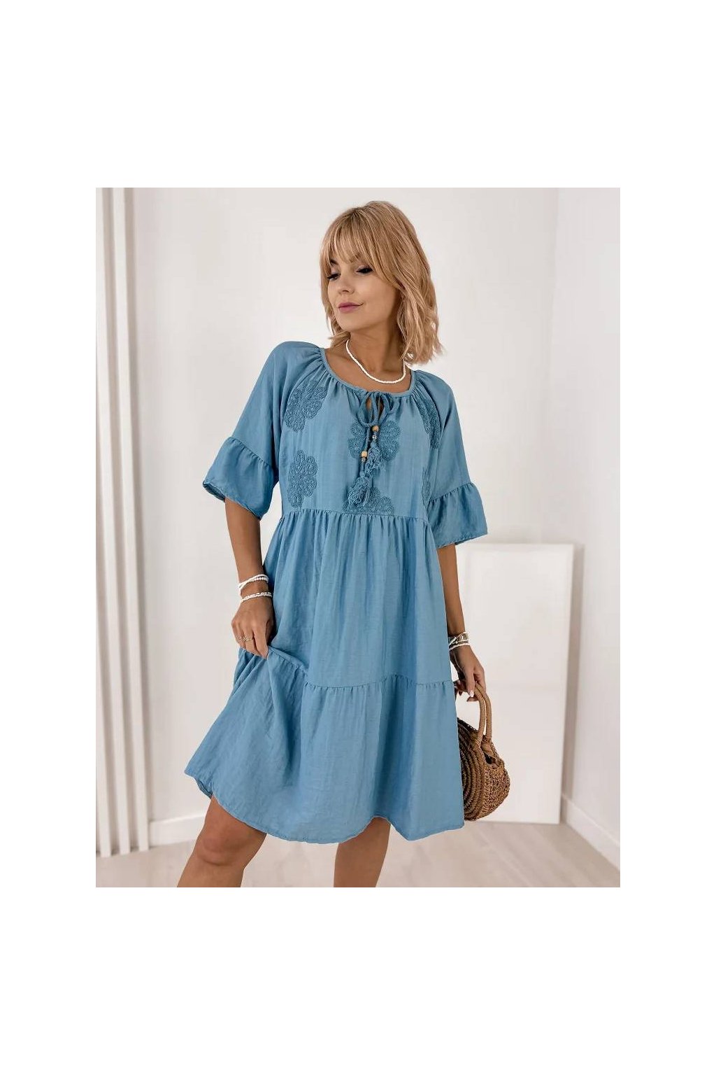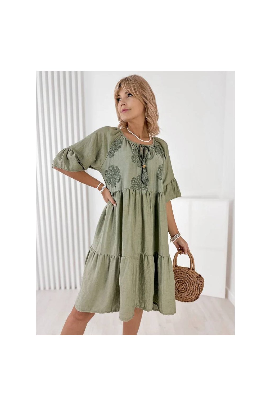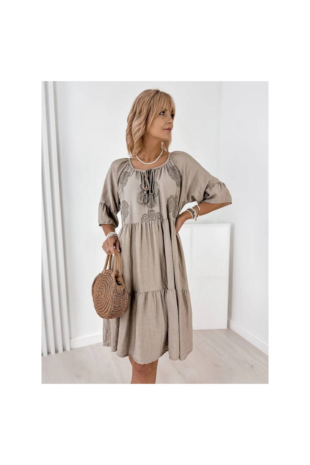 Voľný strih zabezpečuje maximálne pohodlie a lichotí postave. Rukávy v dĺžke 3/4, okrúhly výstrih so šnurovaním a precízne talianske spracovanie robia z týchto šiat nadčasový kúsok do letného šatníka. Skvelé na každodenné nosenie, dovolenku aj mestské prechádzky.