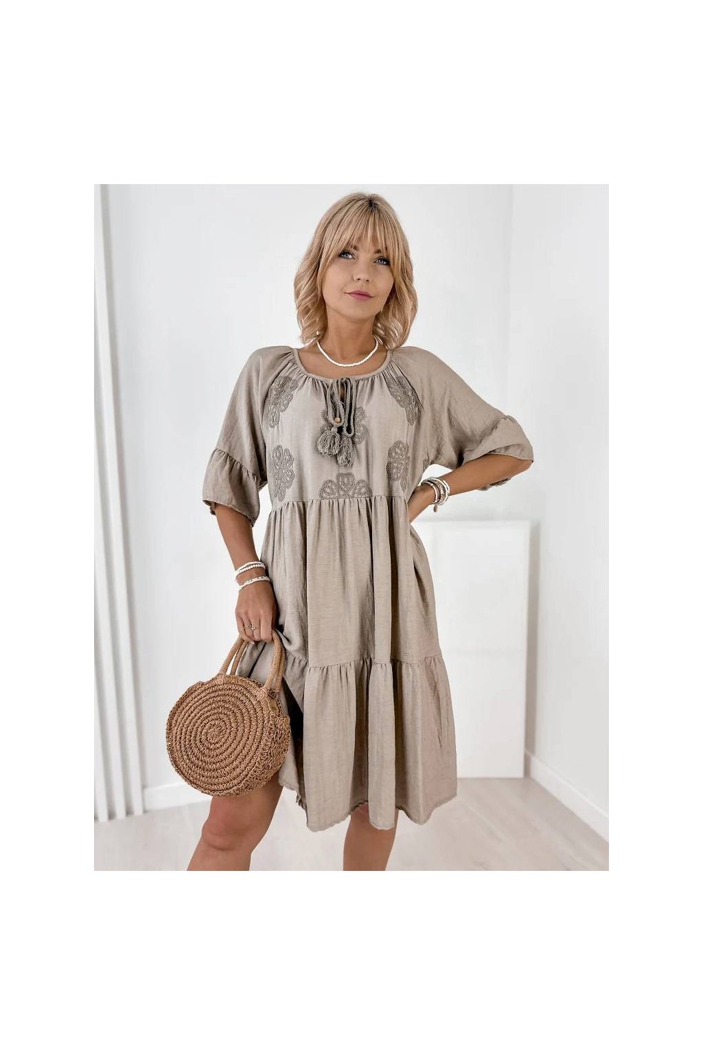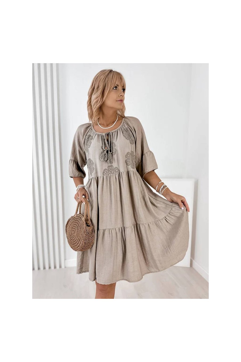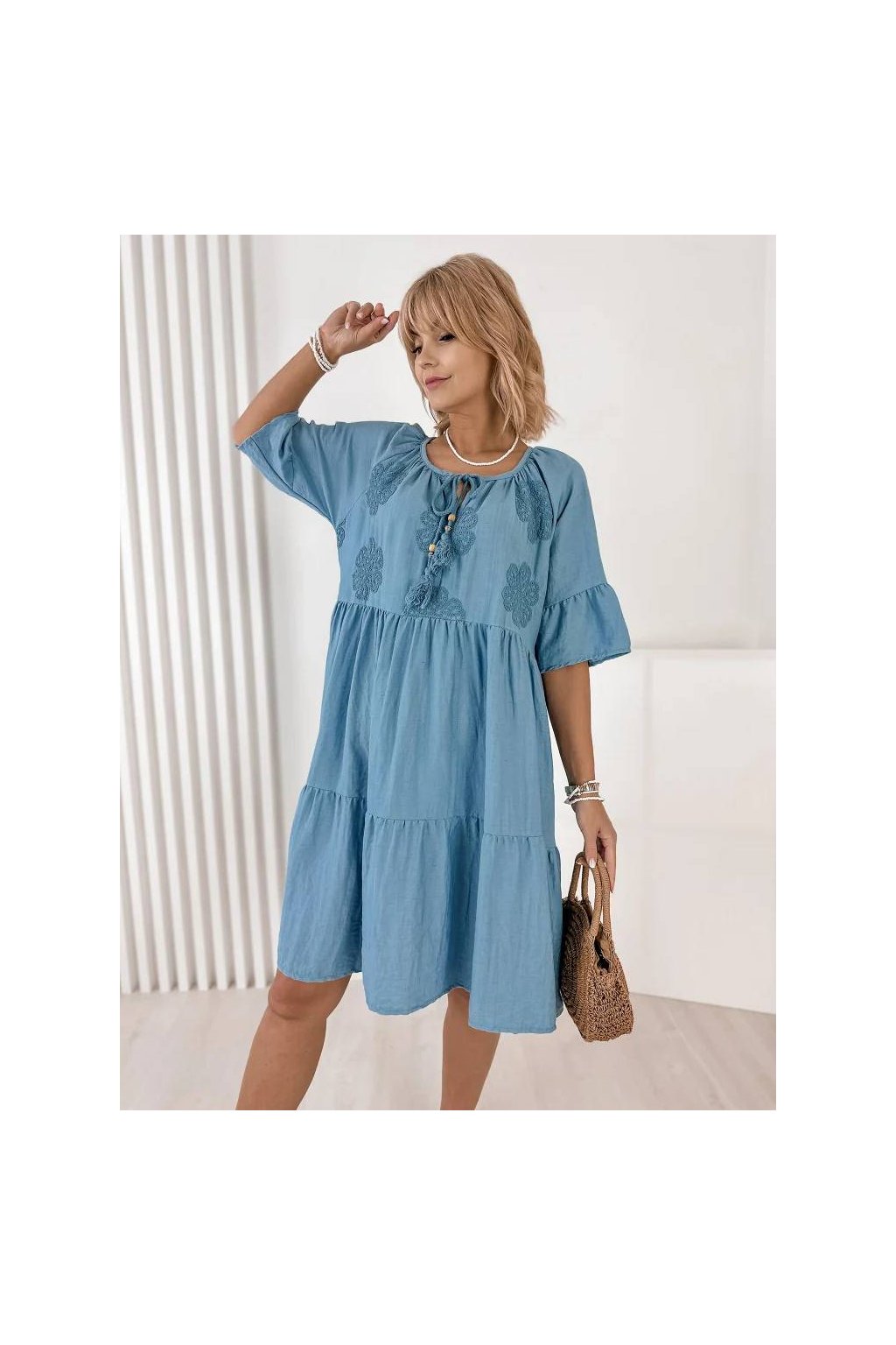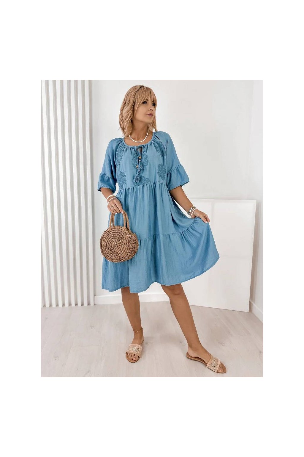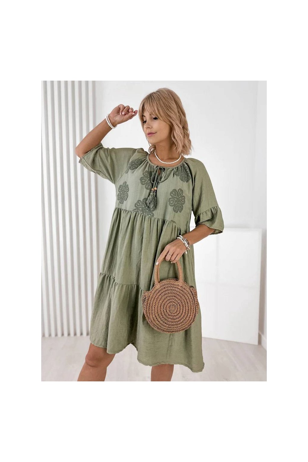 Voľný strih zabezpečuje maximálne pohodlie a lichotí postave. Rukávy v dĺžke 3/4, okrúhly výstrih so šnurovaním a precízne talianske spracovanie robia z týchto šiat nadčasový kúsok do letného šatníka. Skvelé na každodenné nosenie, dovolenku aj mestské prechádzky.