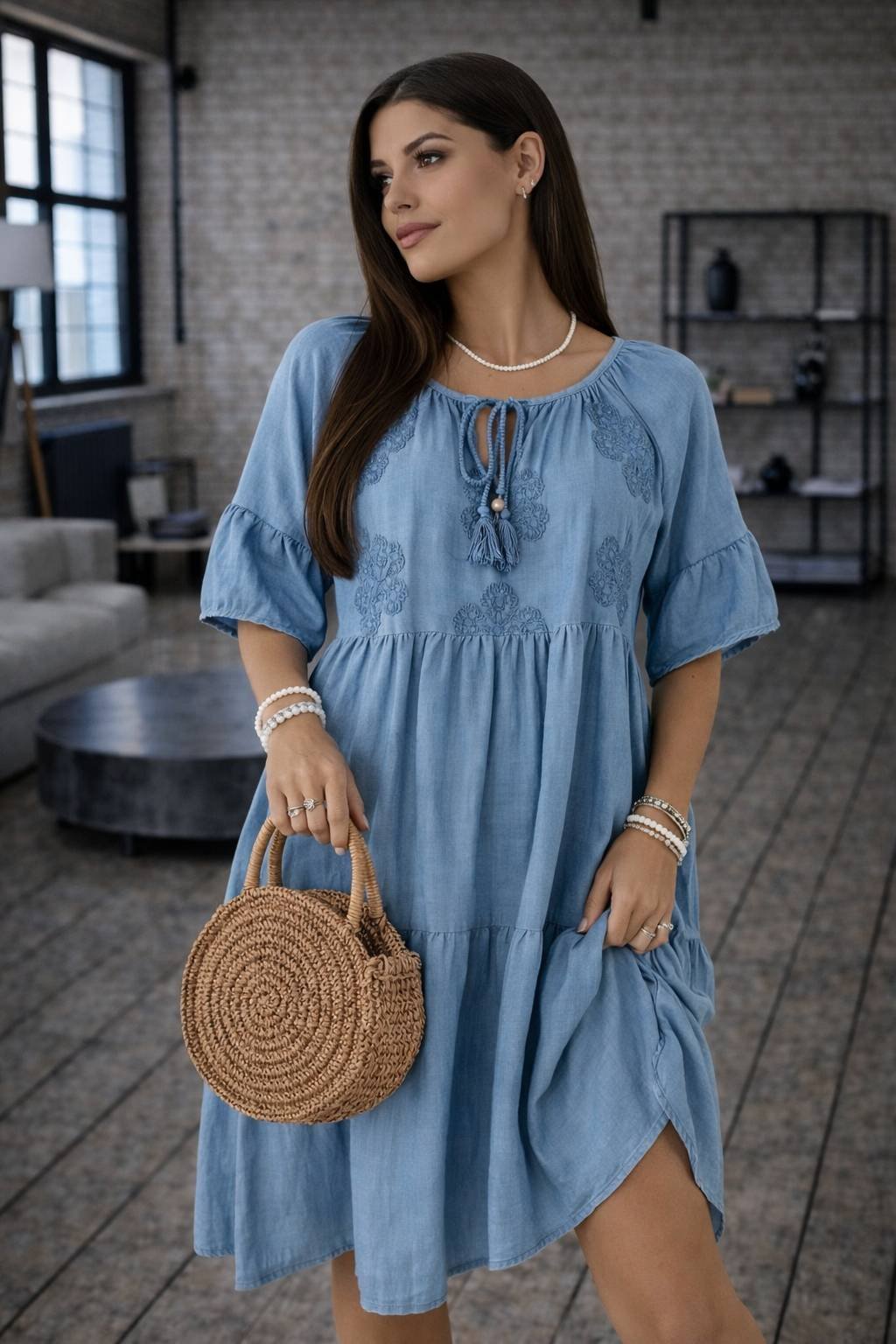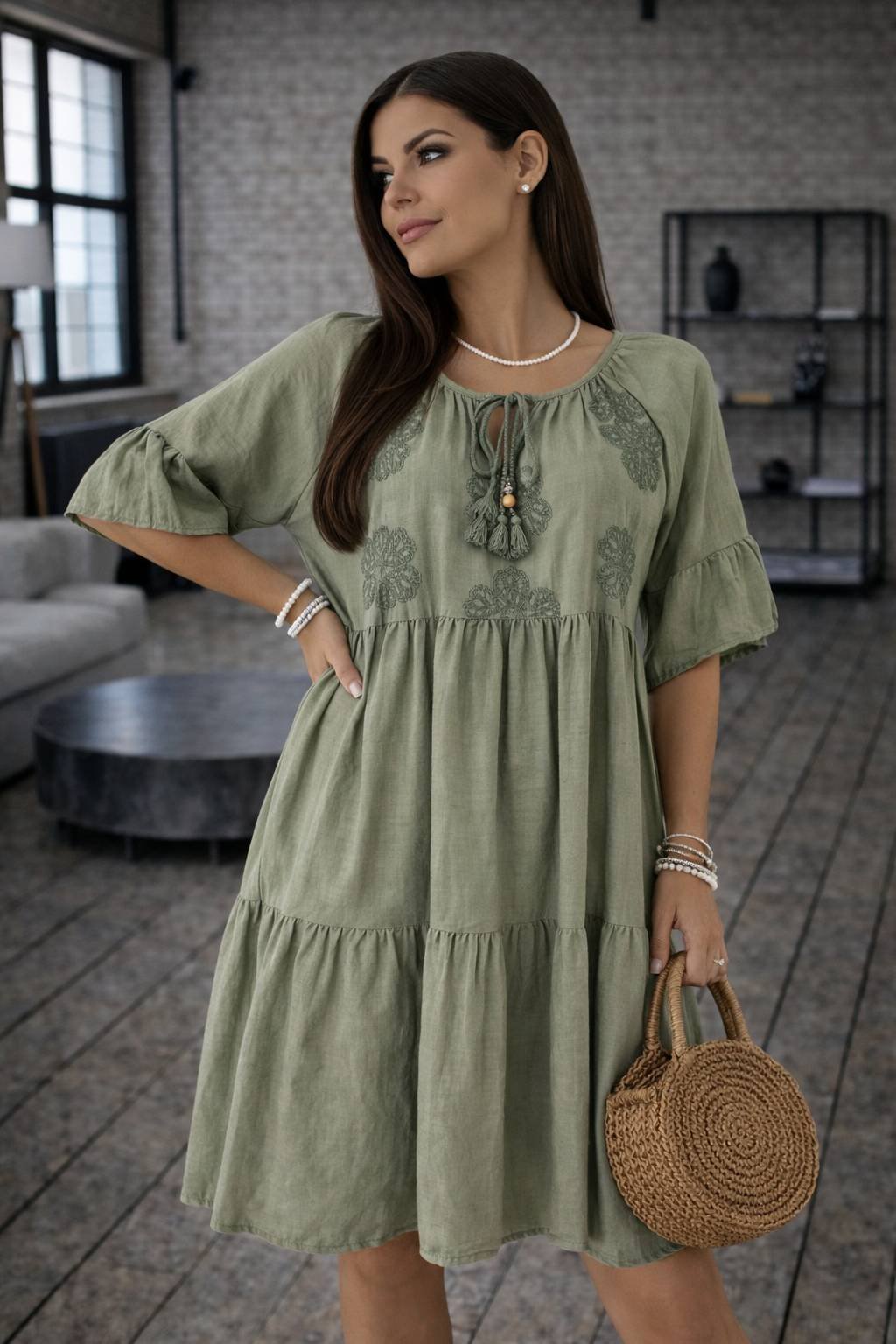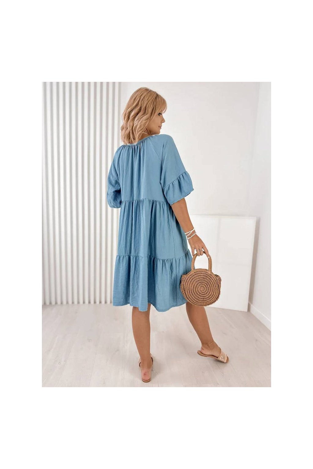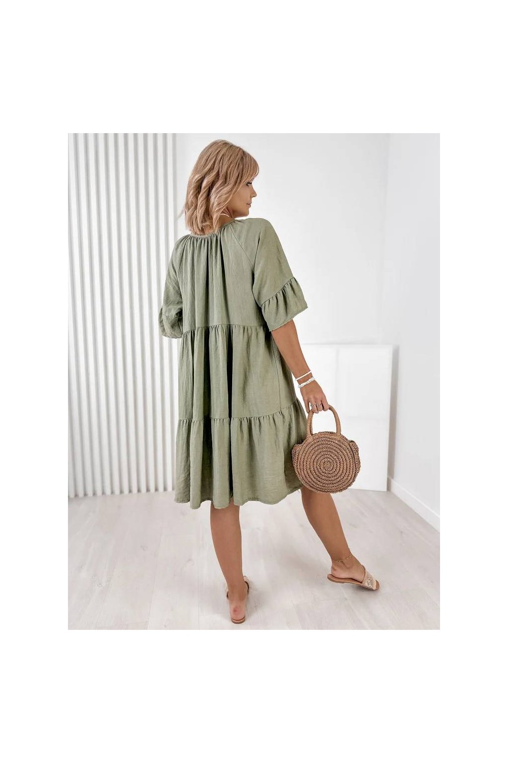 Voľný strih zabezpečuje maximálne pohodlie a lichotí postave. Rukávy v dĺžke 3/4, okrúhly výstrih so šnurovaním a precízne talianske spracovanie robia z týchto šiat nadčasový kúsok do letného šatníka. Skvelé na každodenné nosenie, dovolenku aj mestské prechádzky.