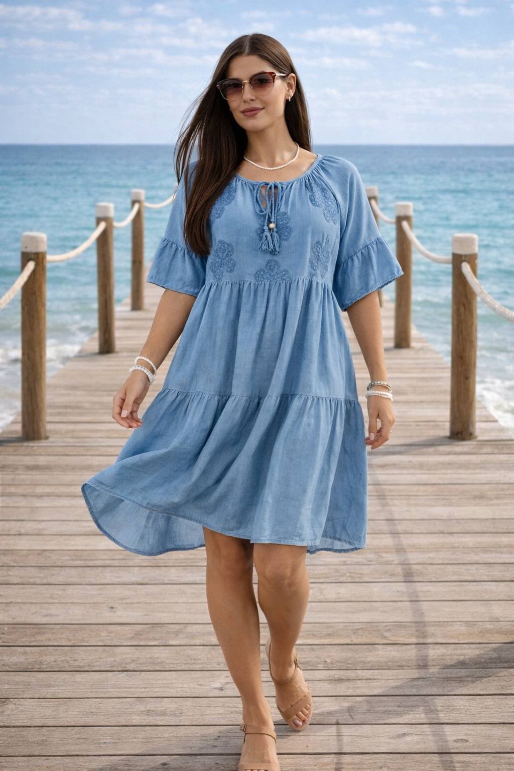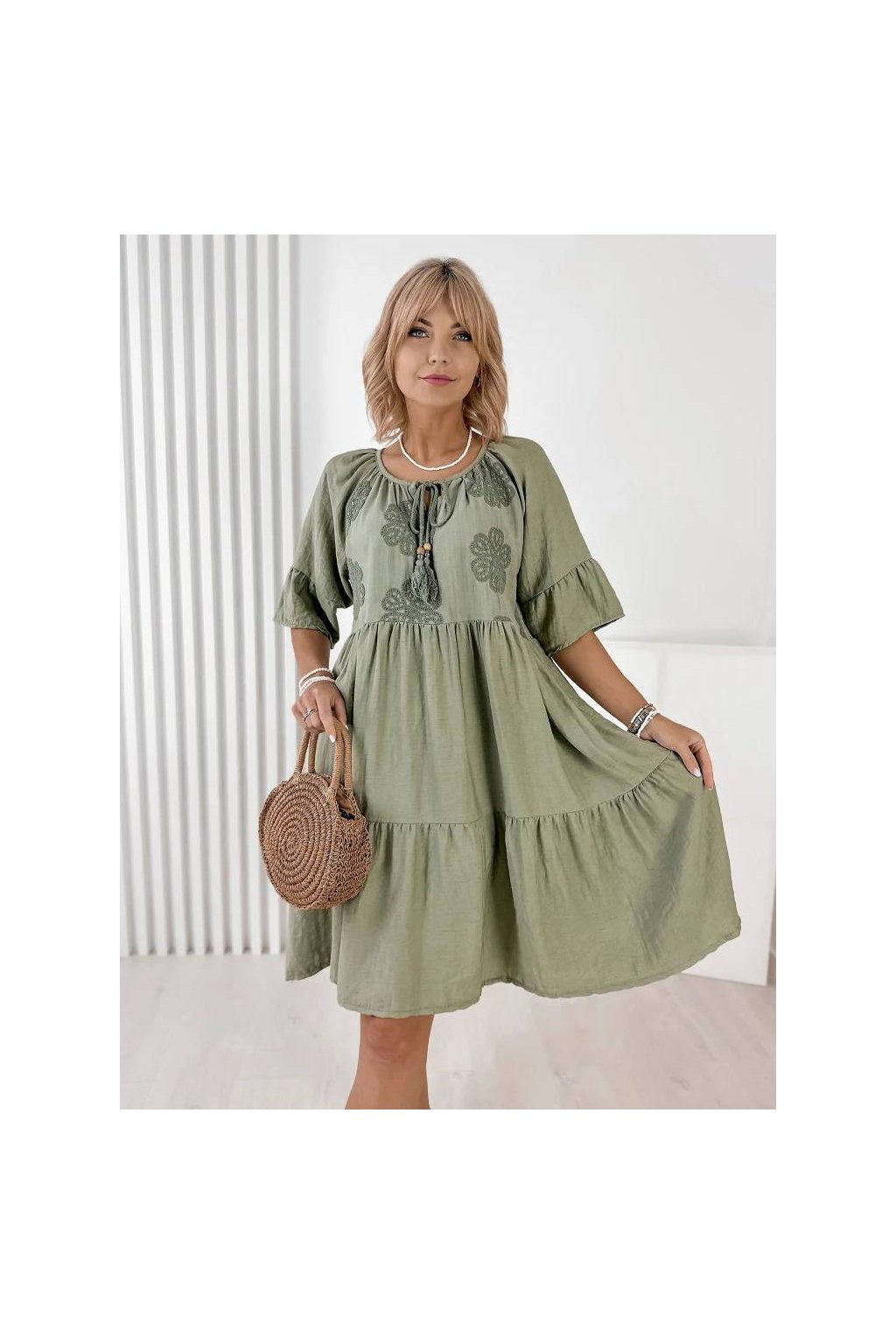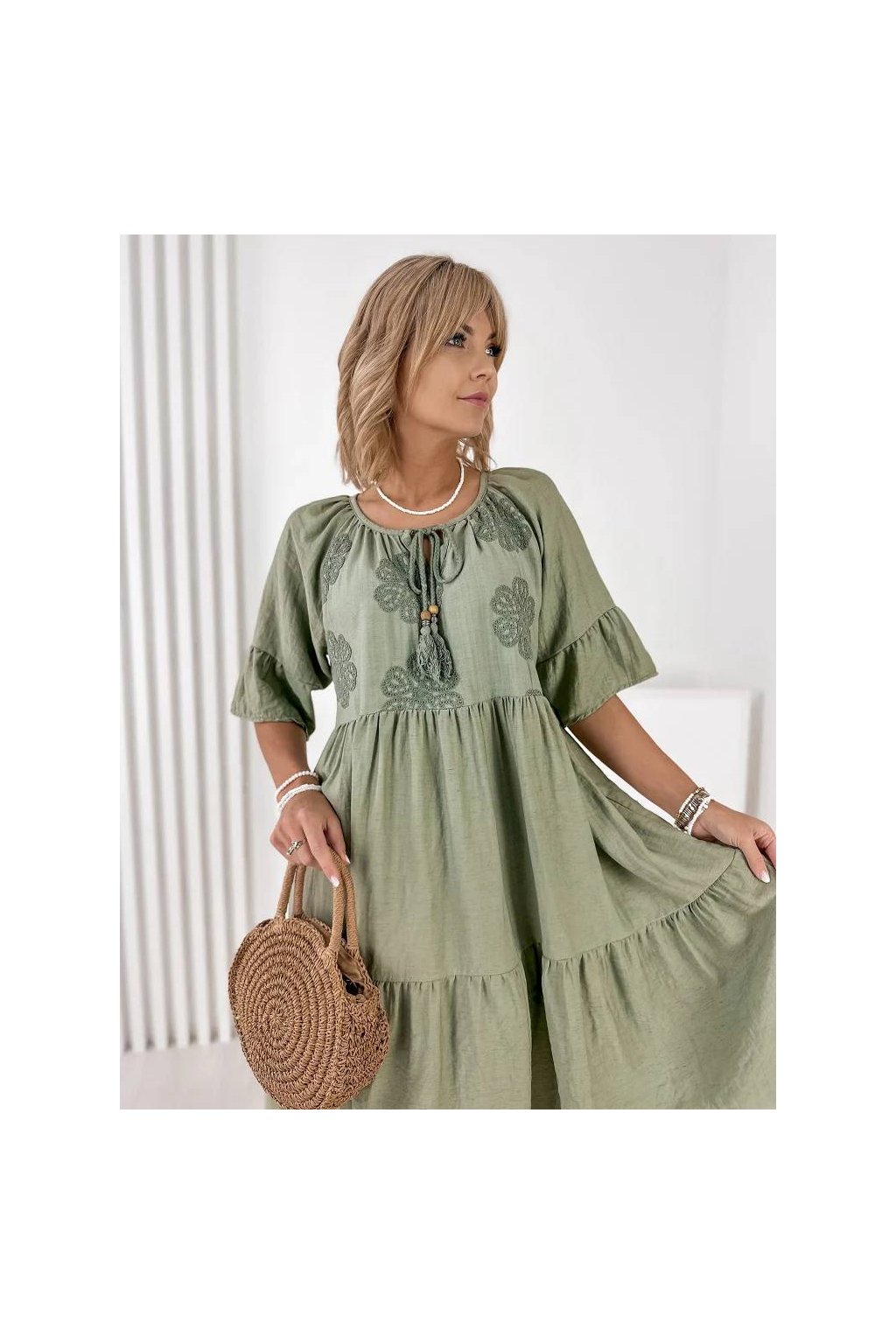 Elegantné a pohodlné dámske šaty v midi dĺžke, vyrobené z kvalitnej zmesi viskózy a ľanu. Materiál je ľahký, priedušný a ideálny na teplé letné dni. Jemná kvetinová výšivka dodáva šatám ženský a romantický vzhľad.