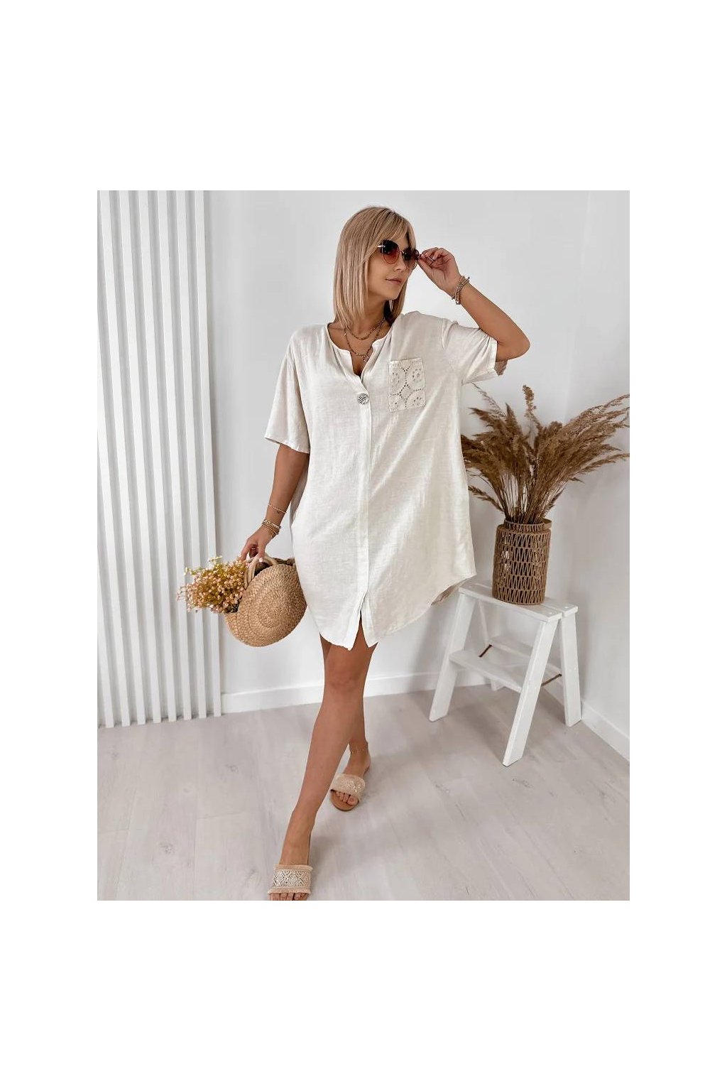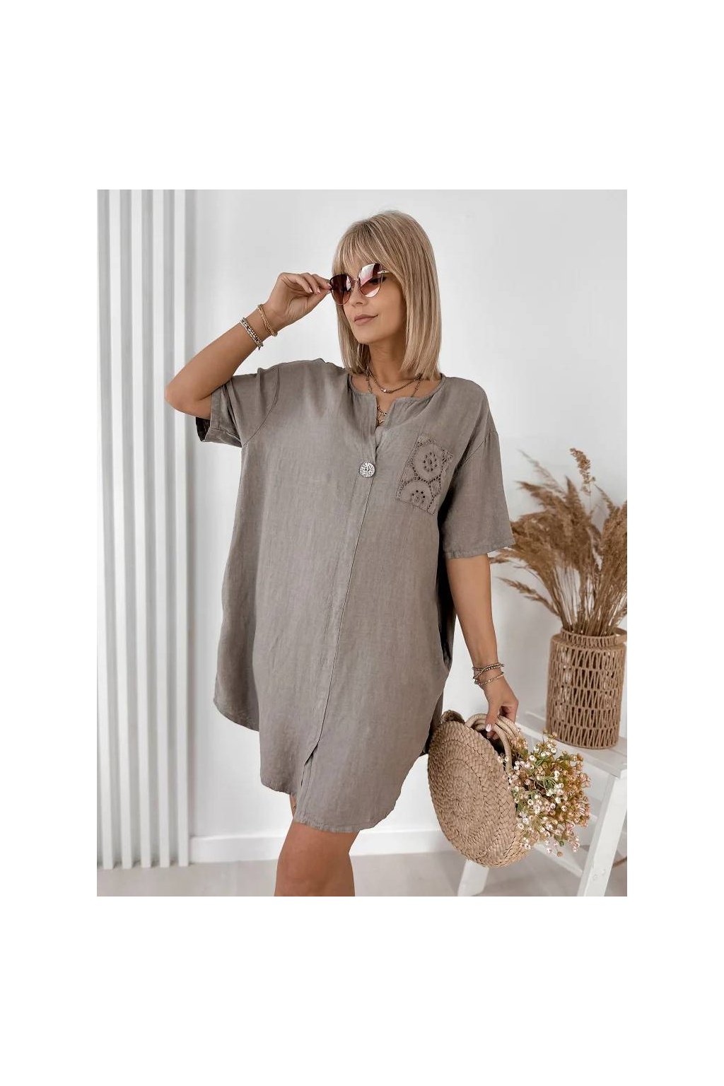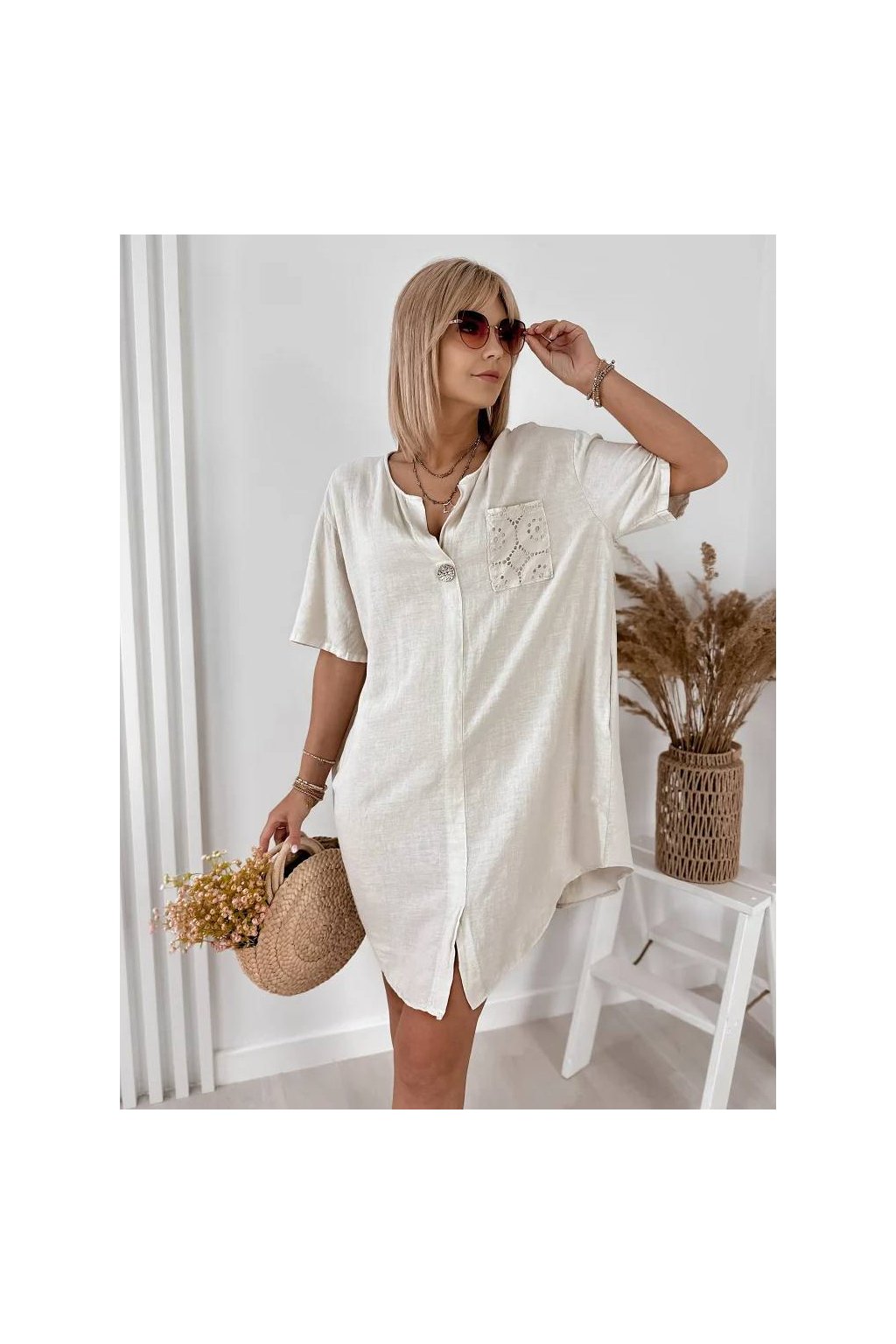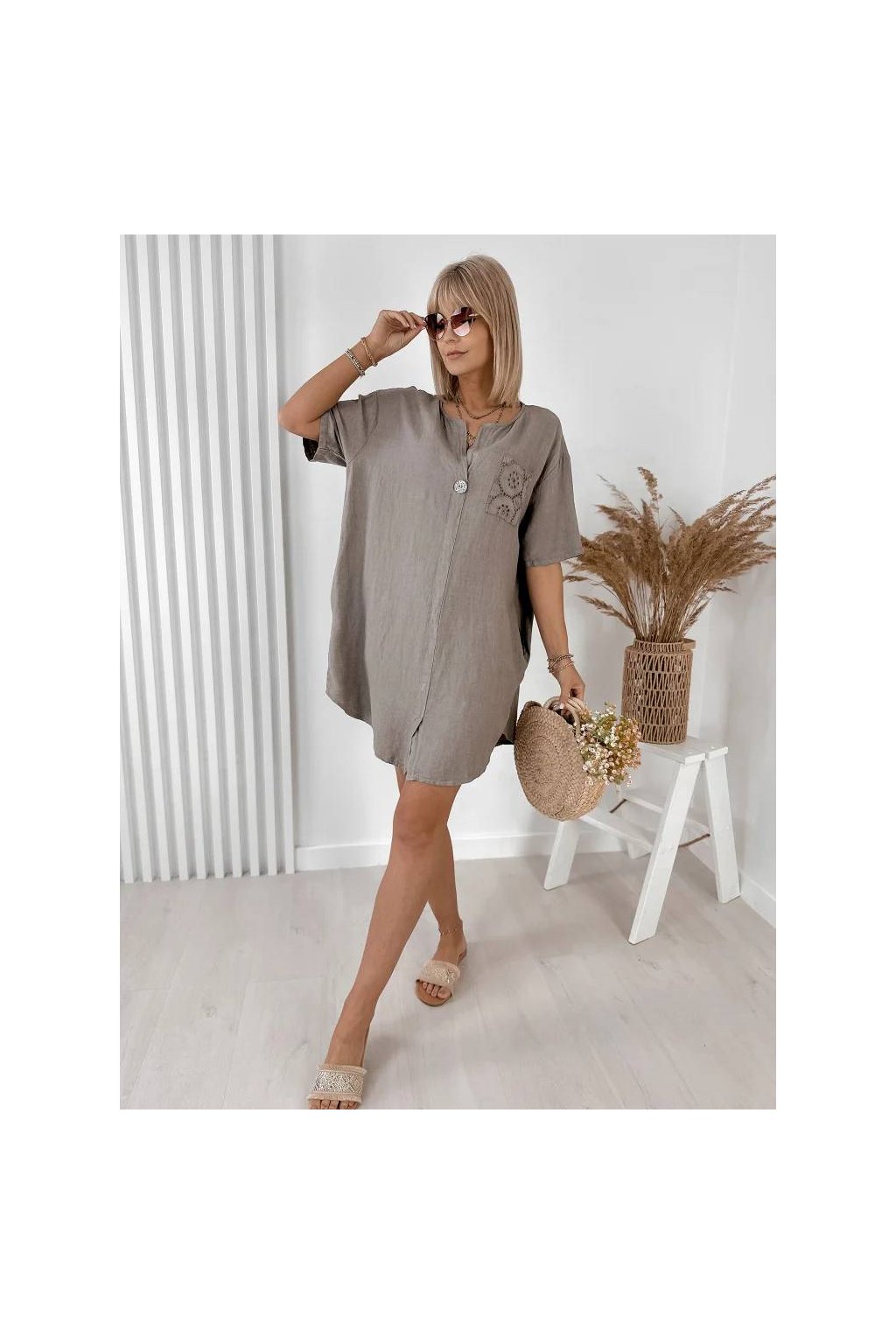 Elegantné dámske mini šaty z ľanu a bavlny, vyrobené v Taliansku. Prírodný, ľahký a priedušný materiál je ideálny na teplé dni a poskytuje maximálne pohodlie počas nosenia. Voľnejší strih jemne splýva s postavou a pôsobí veľmi prirodzene.