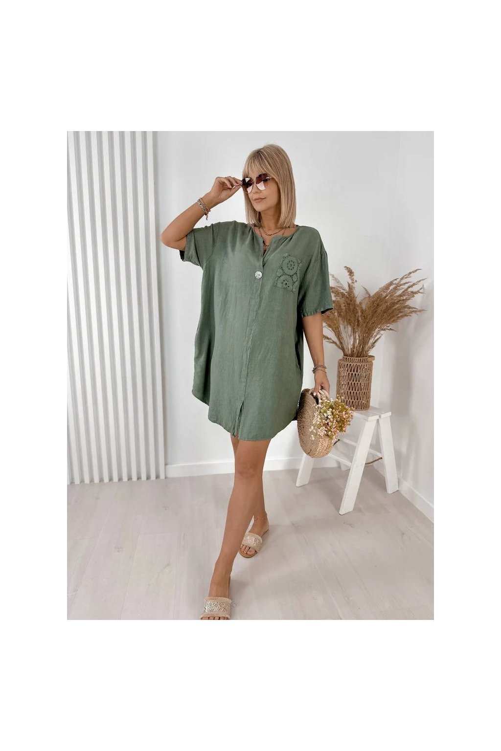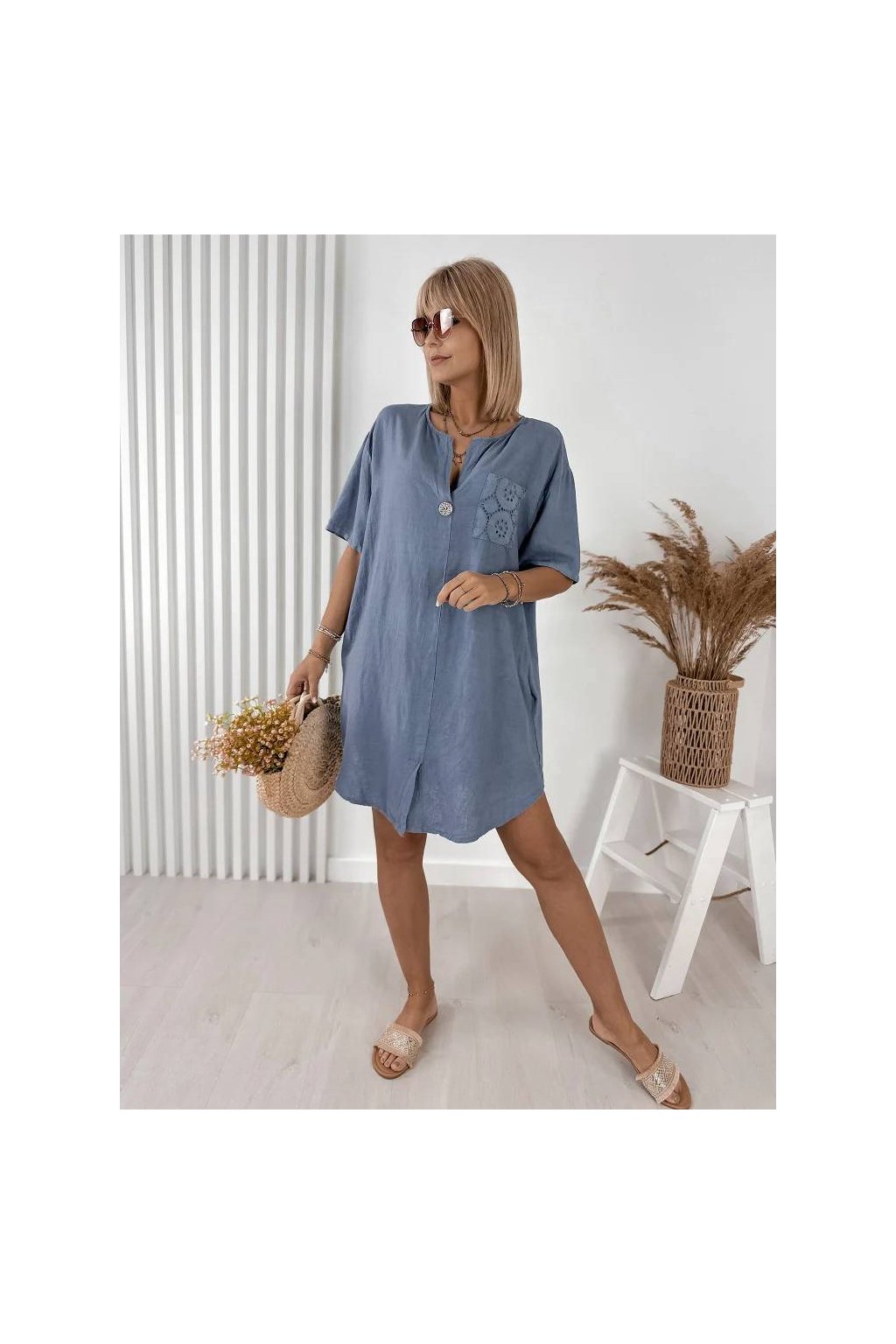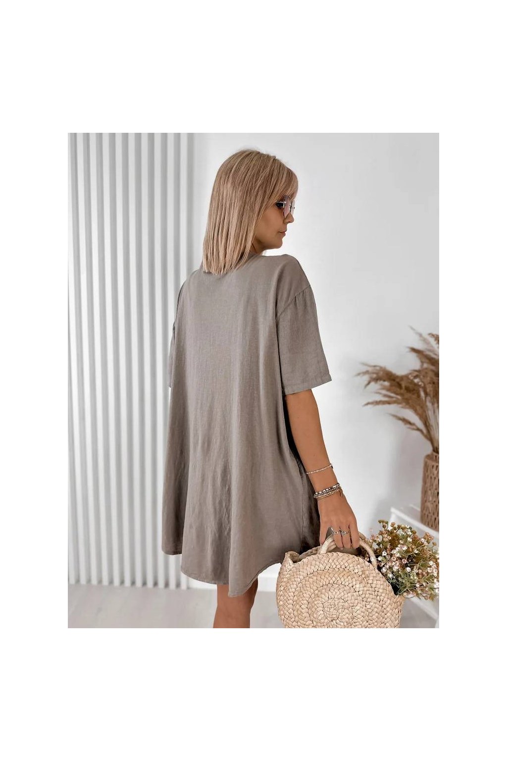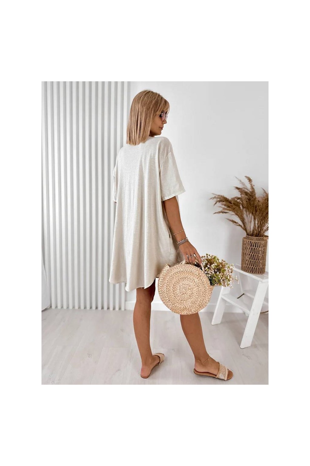 Elegantné dámske mini šaty z ľanu a bavlny, vyrobené v Taliansku. Prírodný, ľahký a priedušný materiál je ideálny na teplé dni a poskytuje maximálne pohodlie počas nosenia. Voľnejší strih jemne splýva s postavou a pôsobí veľmi prirodzene.