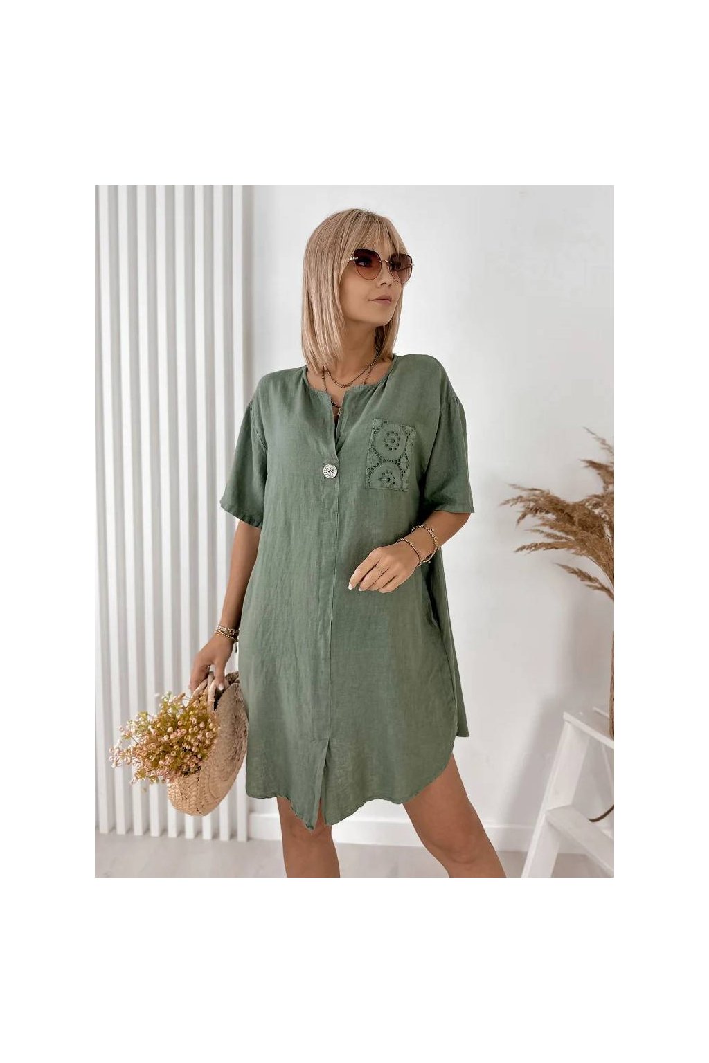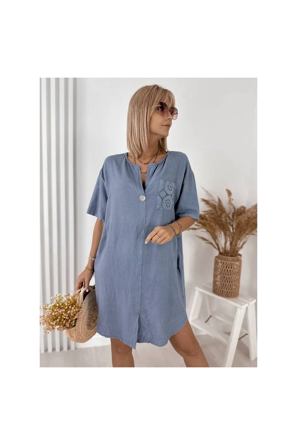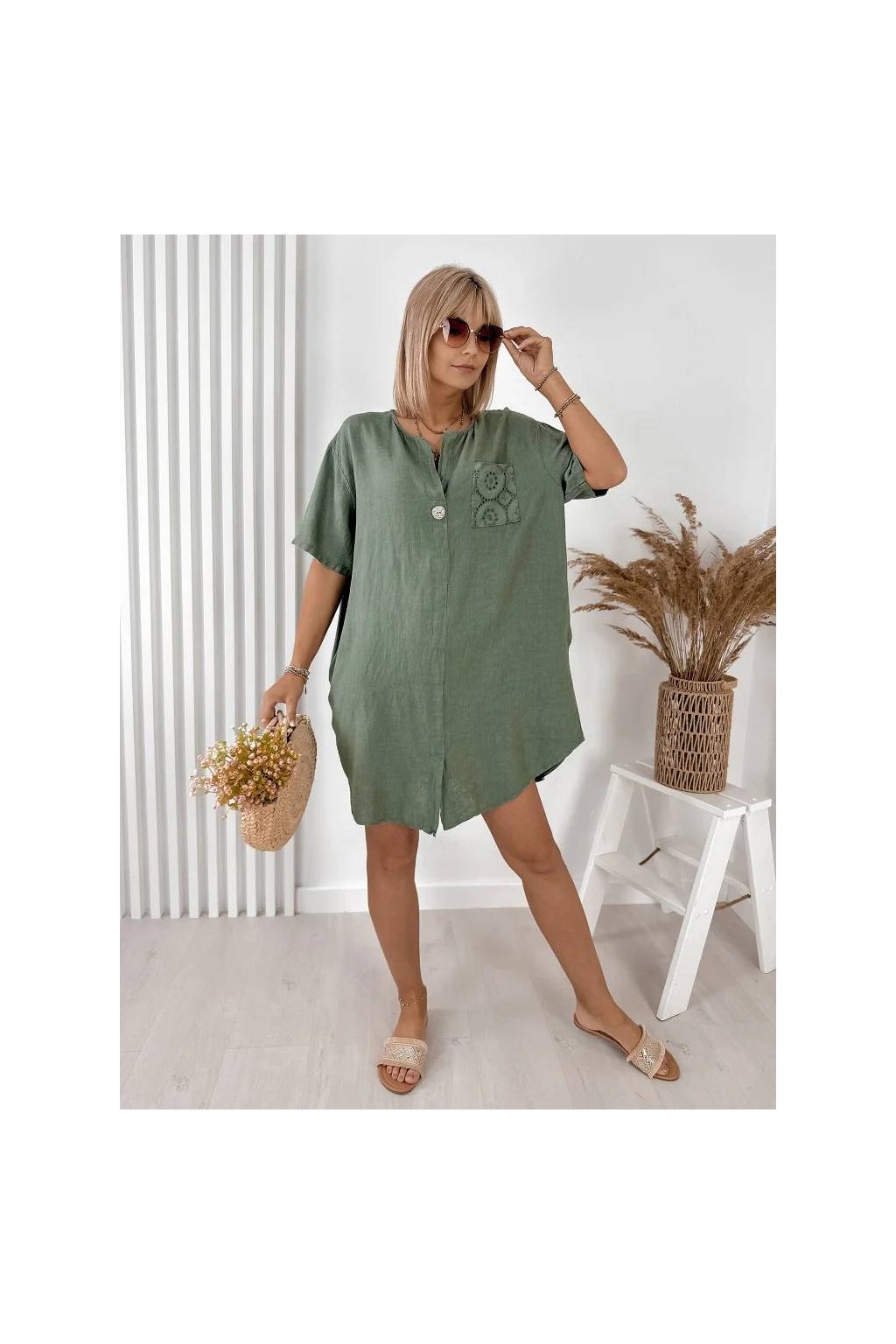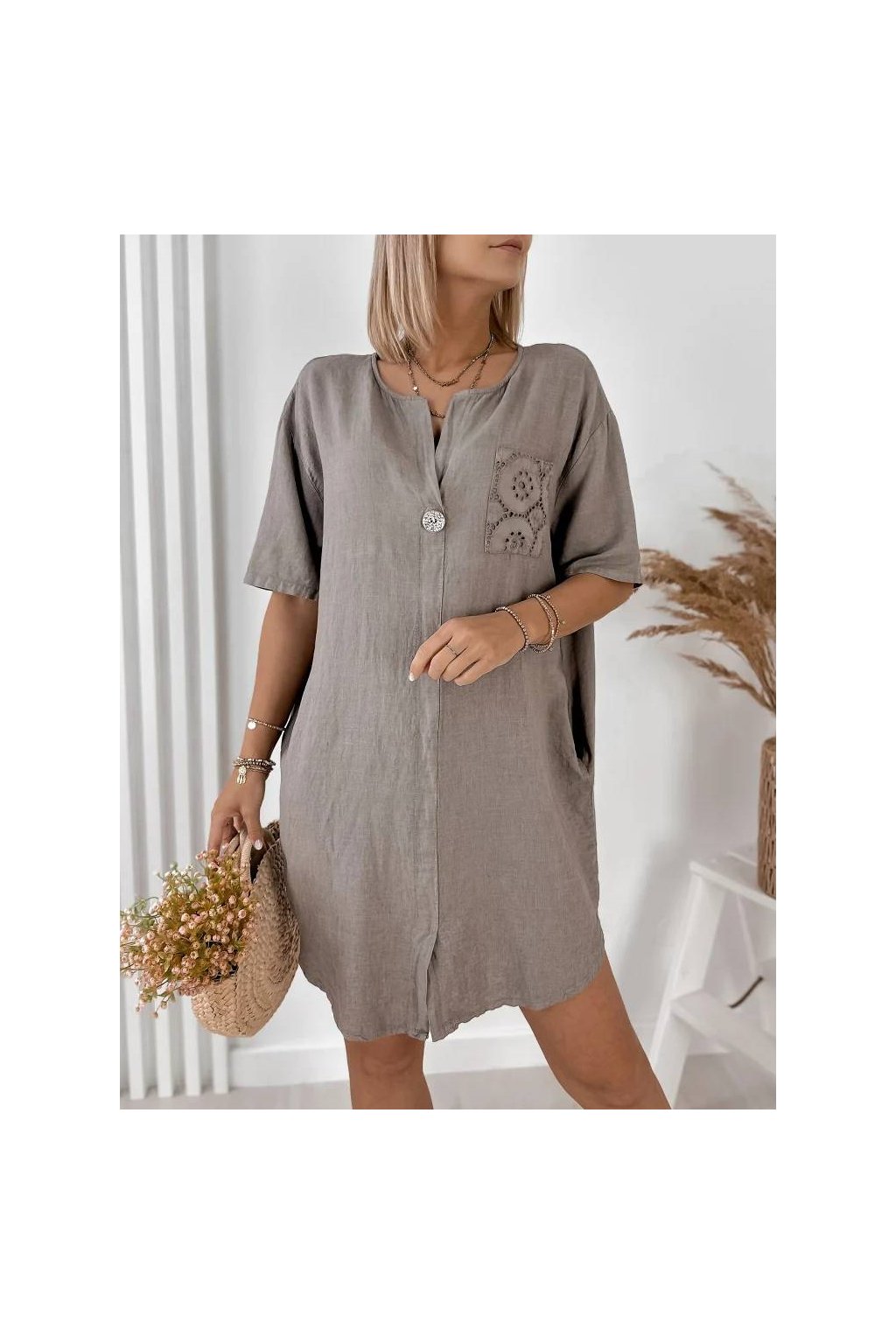Elegantné dámske mini šaty z ľanu a bavlny, vyrobené v Taliansku. Prírodný, ľahký a priedušný materiál je ideálny na teplé dni a poskytuje maximálne pohodlie počas nosenia. Voľnejší strih jemne splýva s postavou a pôsobí veľmi prirodzene.