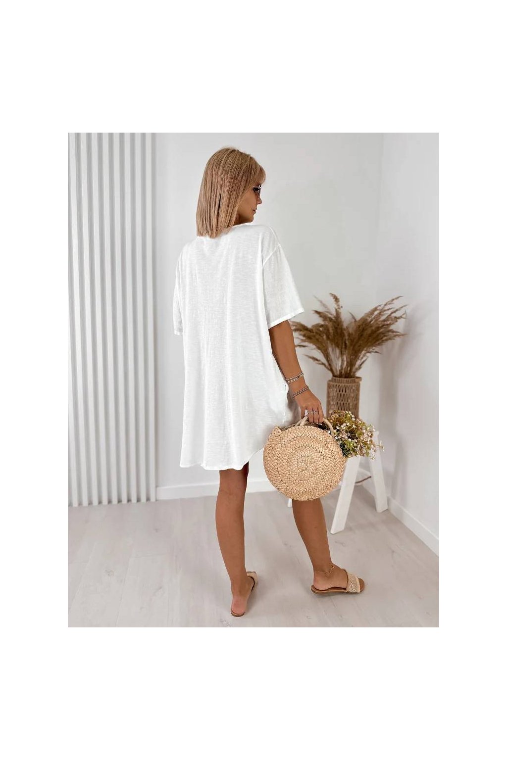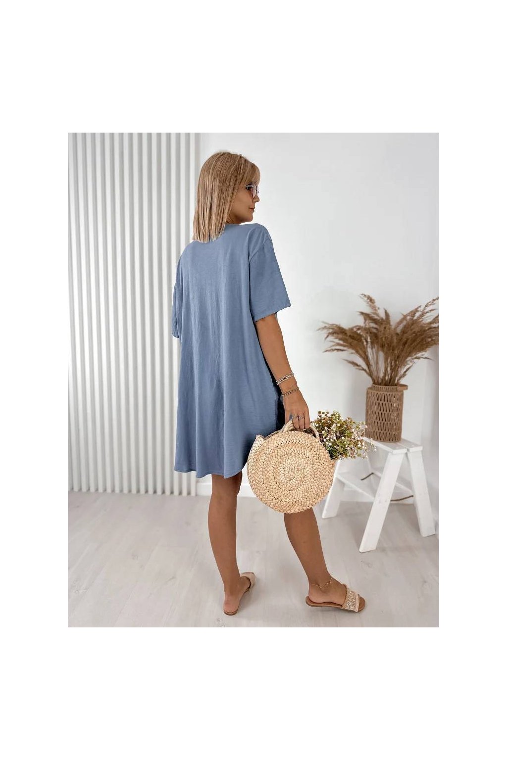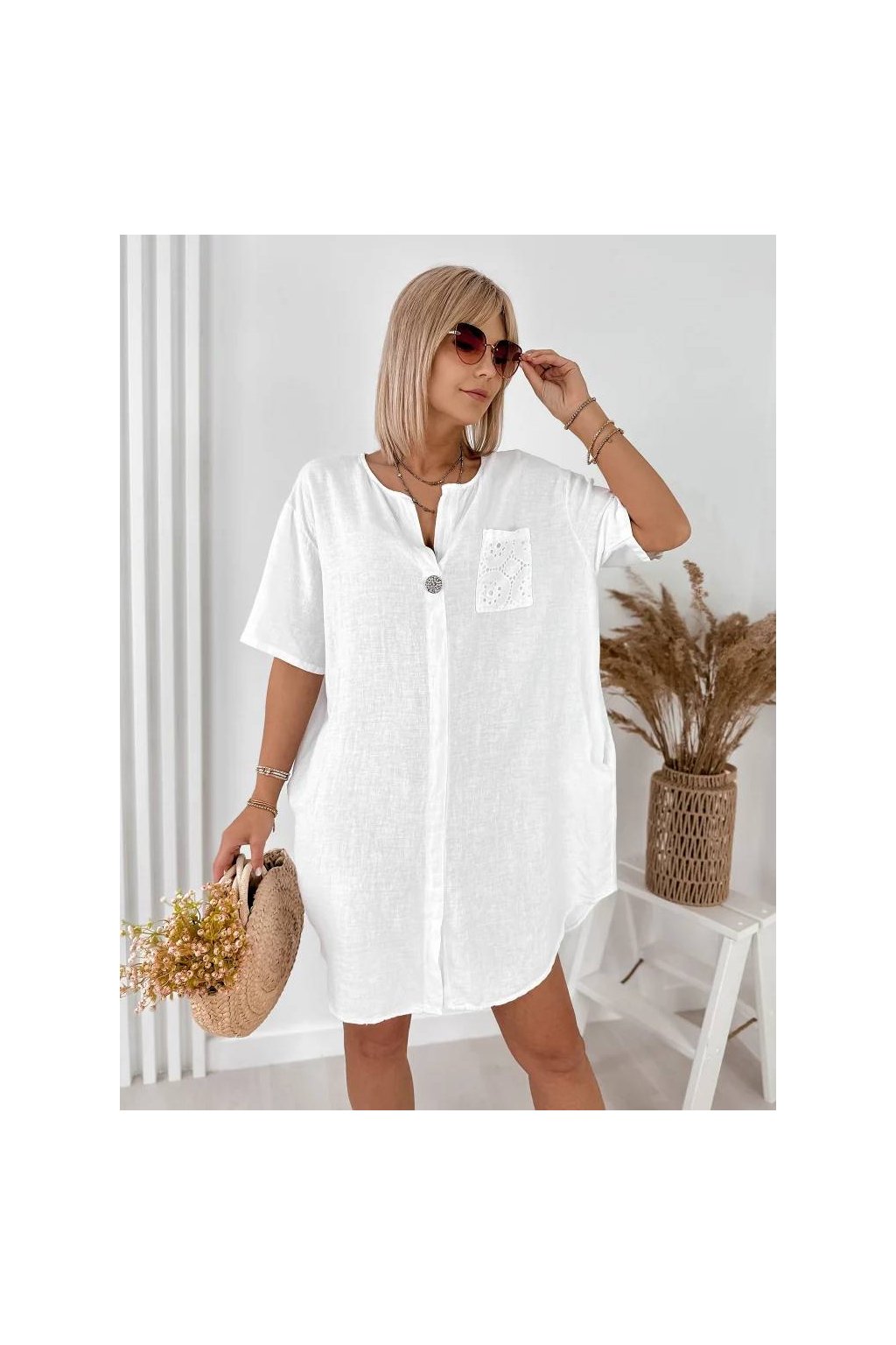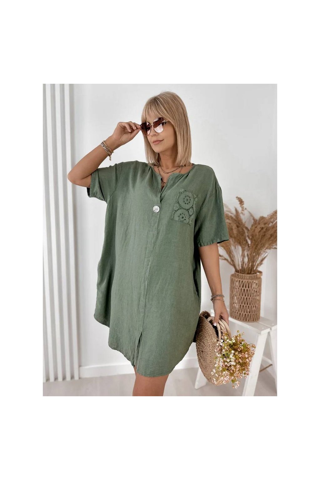 Elegantné dámske mini šaty z ľanu a bavlny, vyrobené v Taliansku. Prírodný, ľahký a priedušný materiál je ideálny na teplé dni a poskytuje maximálne pohodlie počas nosenia. Voľnejší strih jemne splýva s postavou a pôsobí veľmi prirodzene.