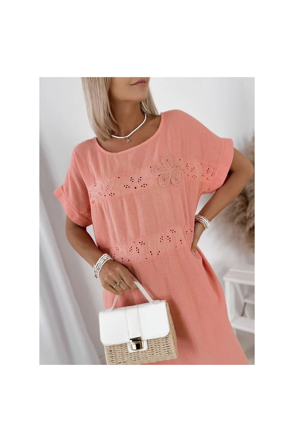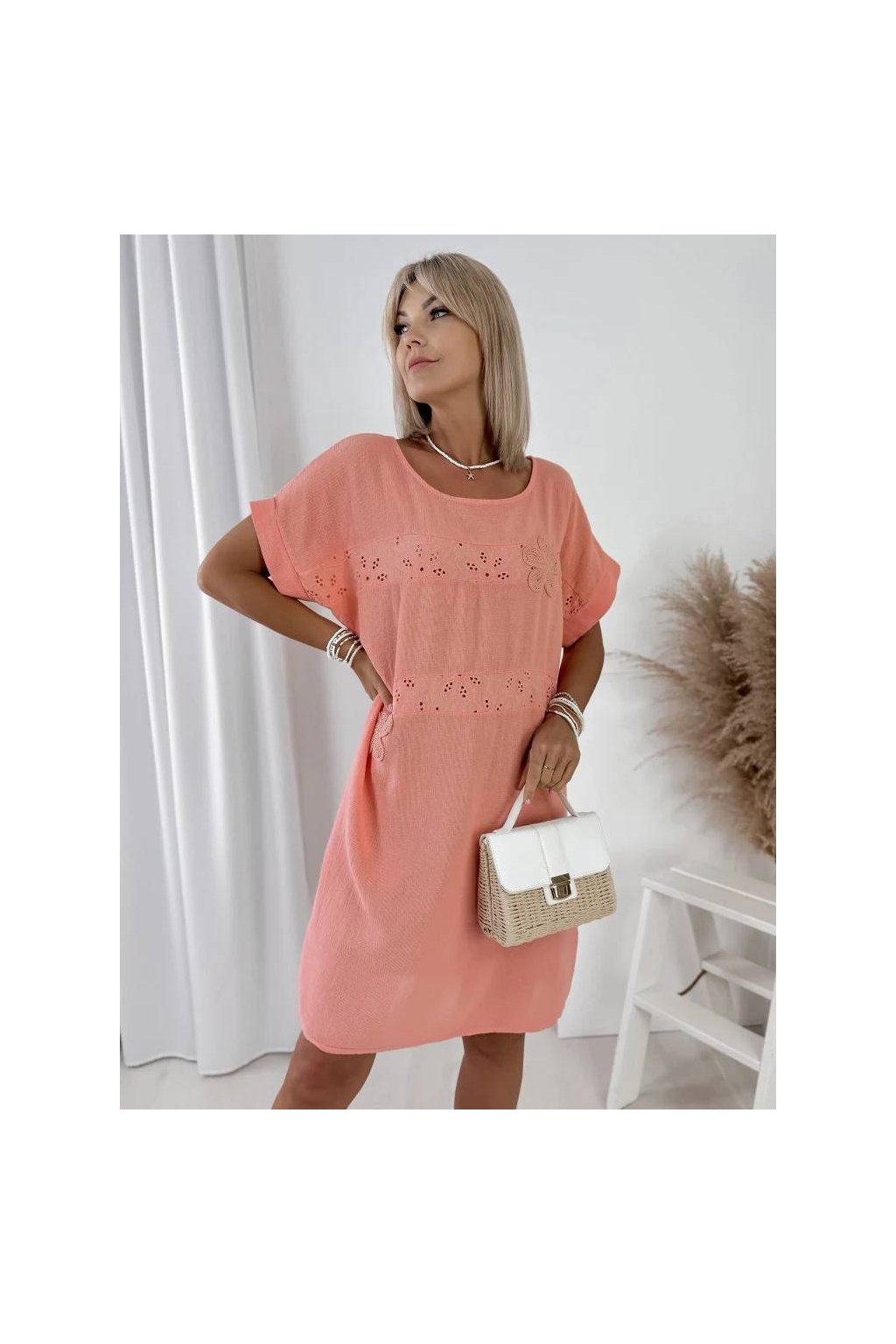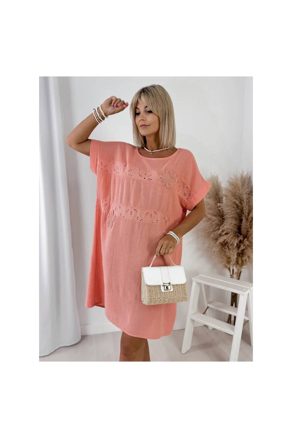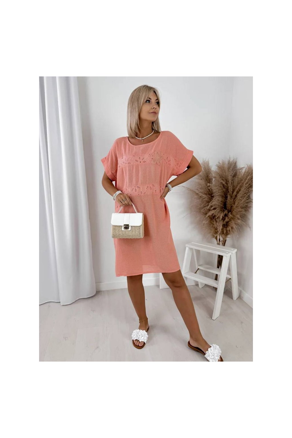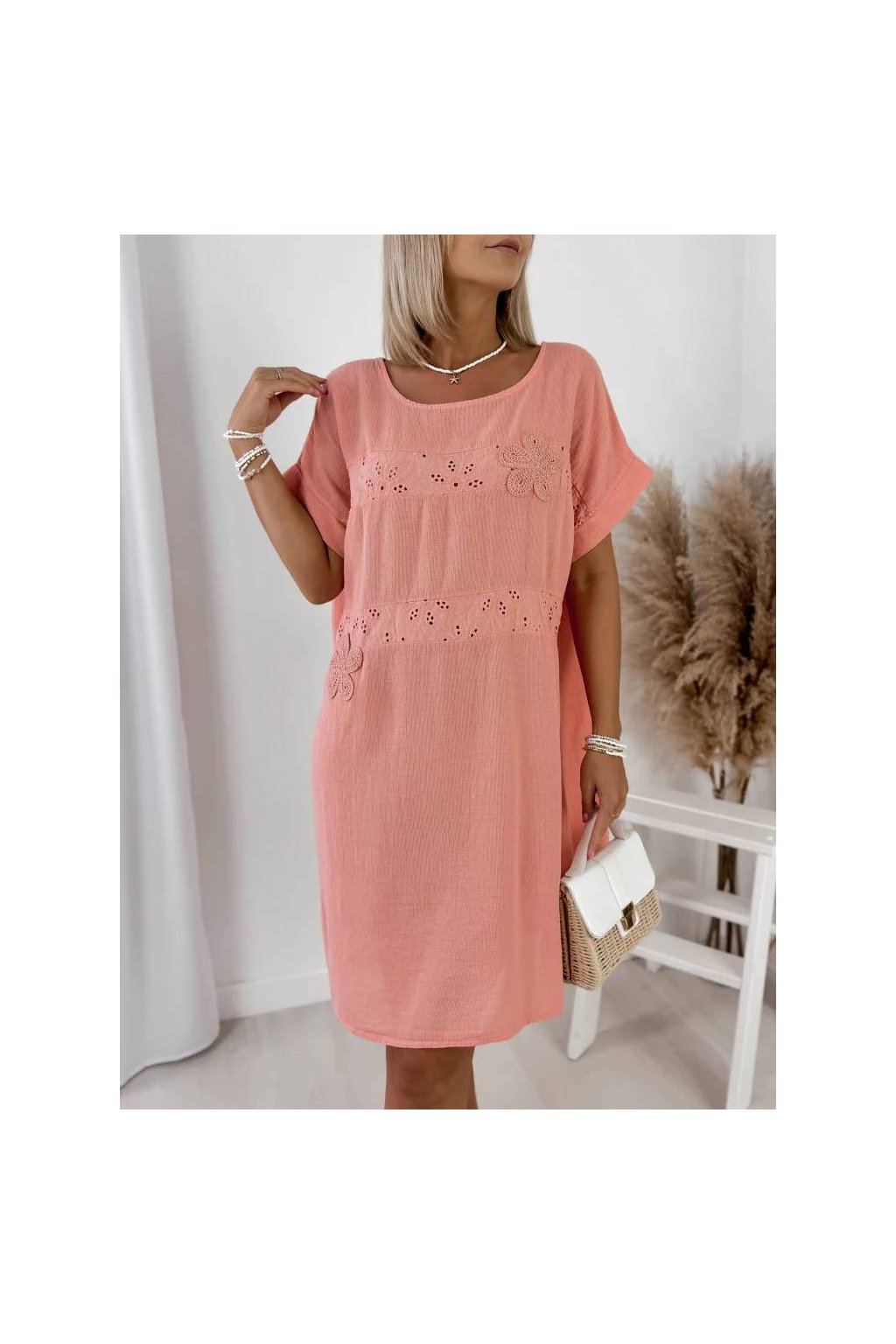 Tieto dámske voľné šaty zo 100% bavlny sú ideálnou voľbou na každodenné nosenie počas teplých dní. Jemná výšivka s kvetinovým motívom dodáva modelu romantický a svieži vzhľad.