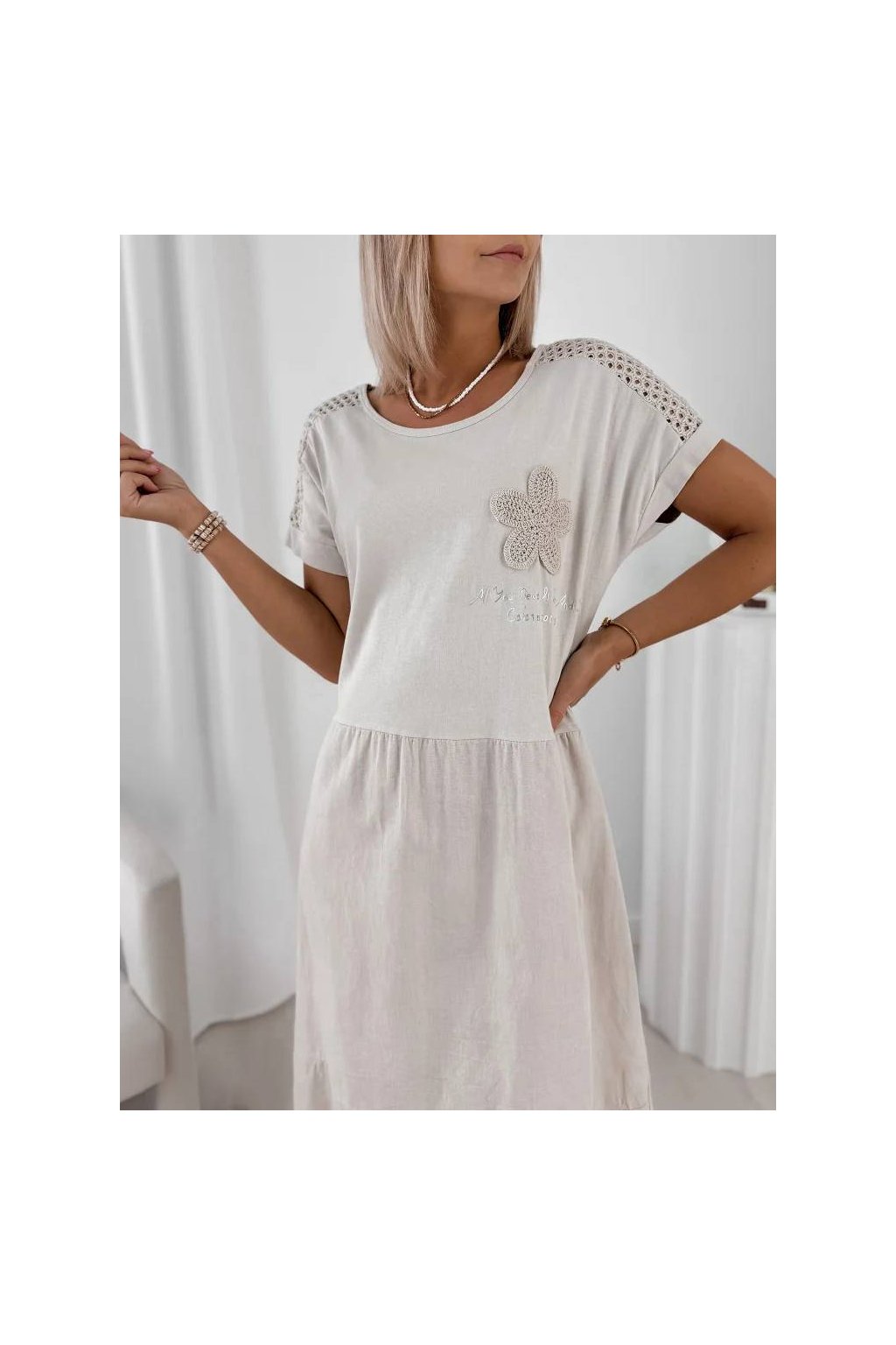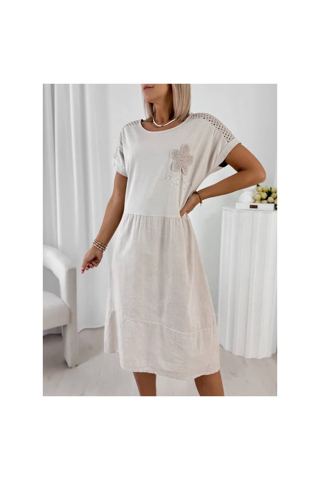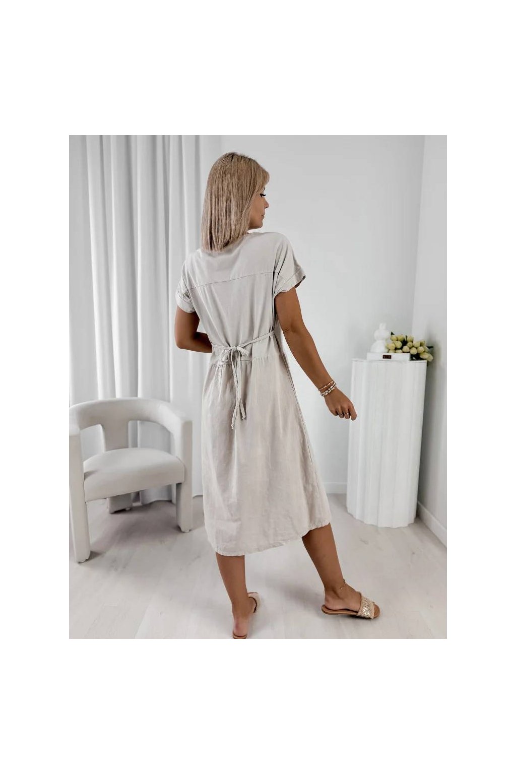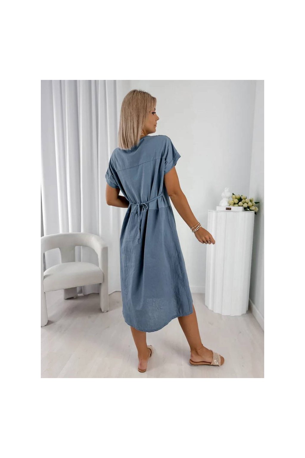 Šaty majú okrúhly výstrih, krátky rukáv a viazanie v páse, vďaka ktorému si môžete strih prispôsobiť podľa potreby. Kombinácia bavlny a ľanu je ľahká, priedušná a ideálna na teplé dni. Midi dĺžka pôsobí elegantne a univerzálne – vhodná na bežné nosenie aj letné príležitosti.