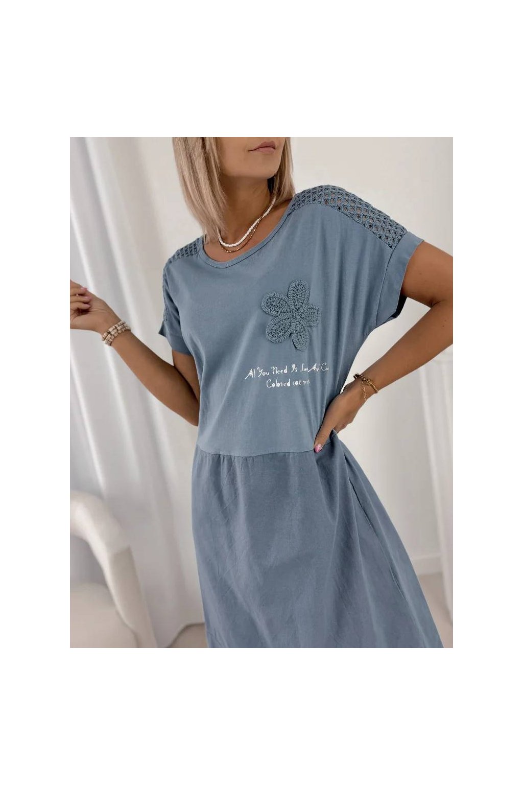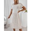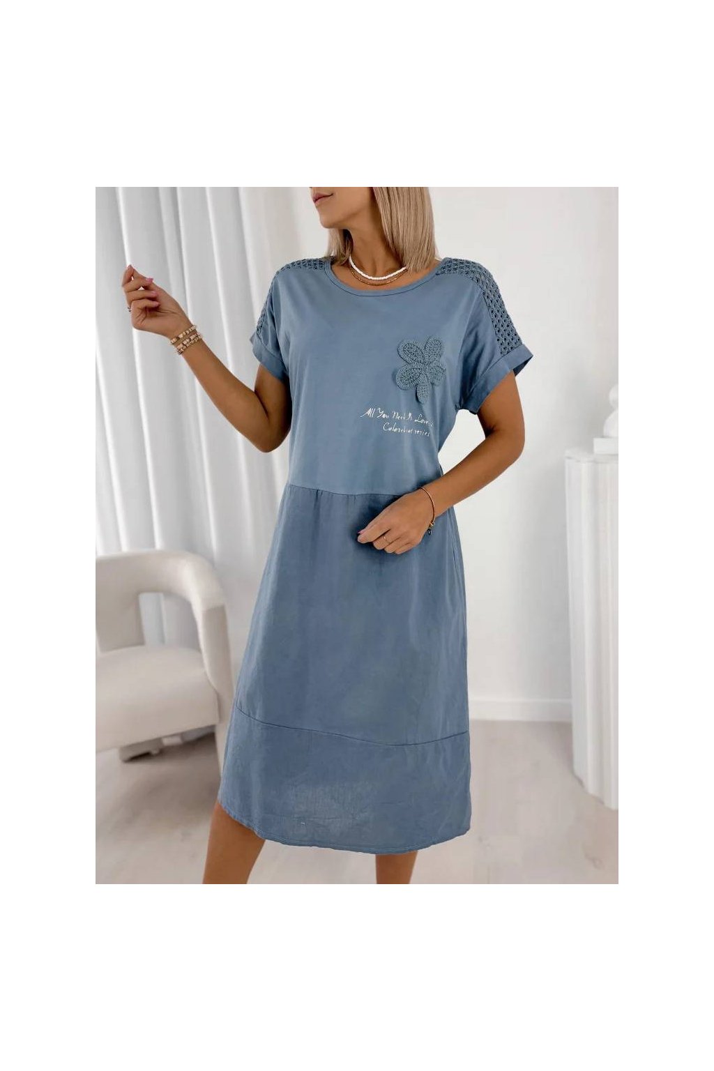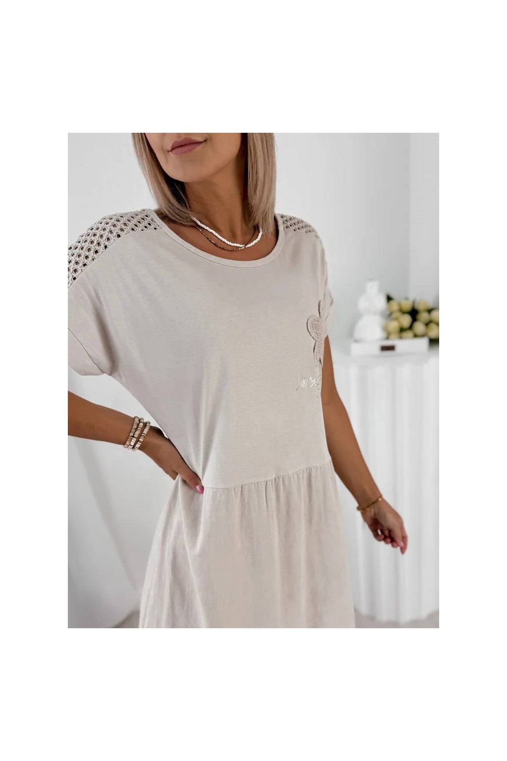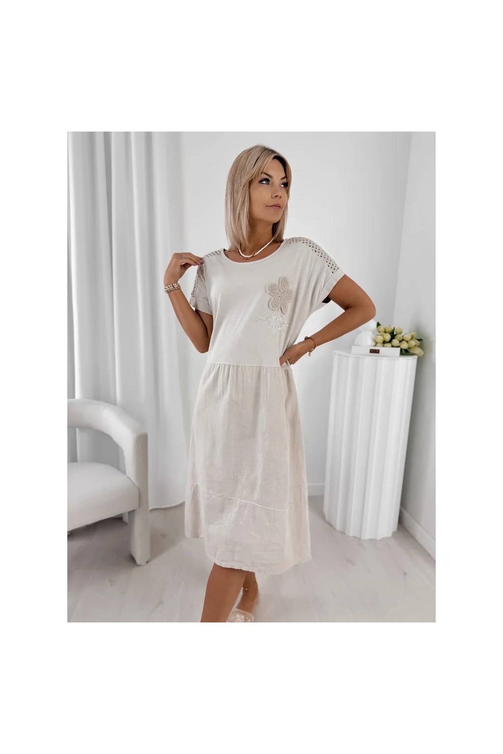 Šaty majú okrúhly výstrih, krátky rukáv a viazanie v páse, vďaka ktorému si môžete strih prispôsobiť podľa potreby. Kombinácia bavlny a ľanu je ľahká, priedušná a ideálna na teplé dni. Midi dĺžka pôsobí elegantne a univerzálne – vhodná na bežné nosenie aj letné príležitosti.