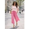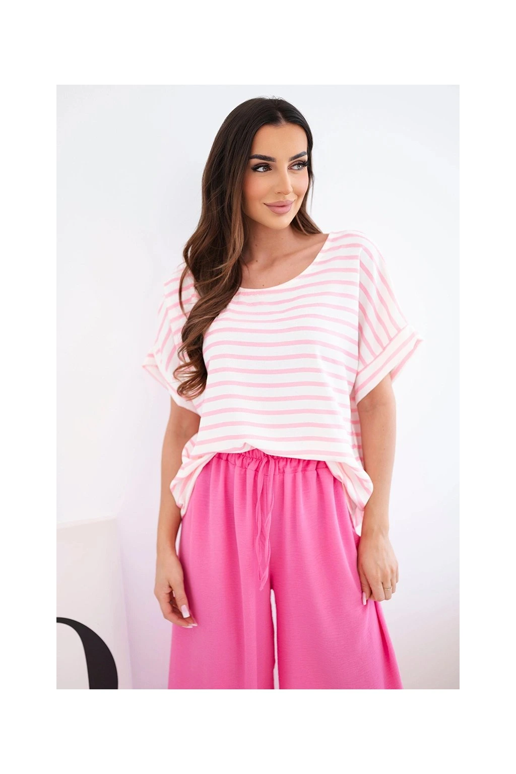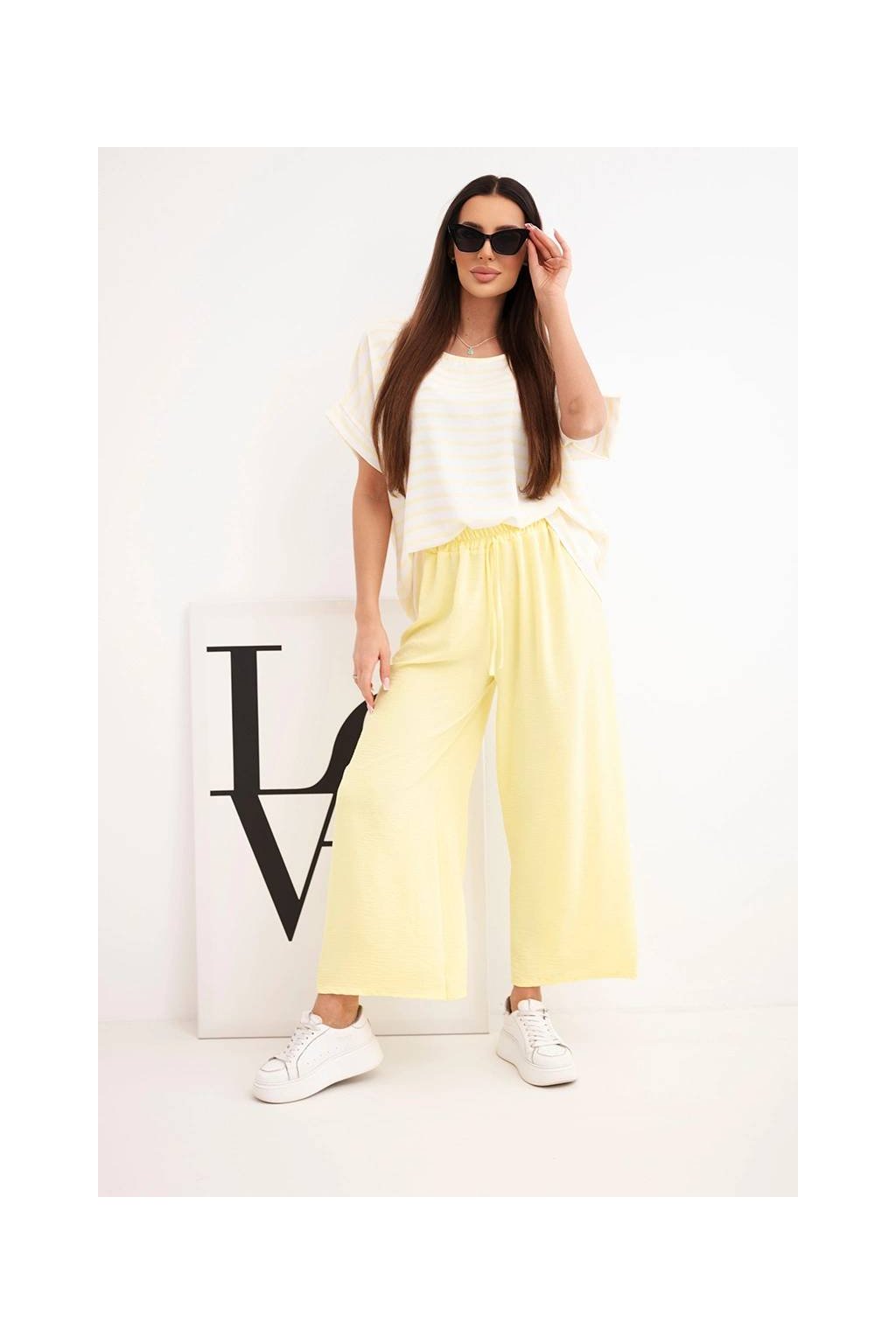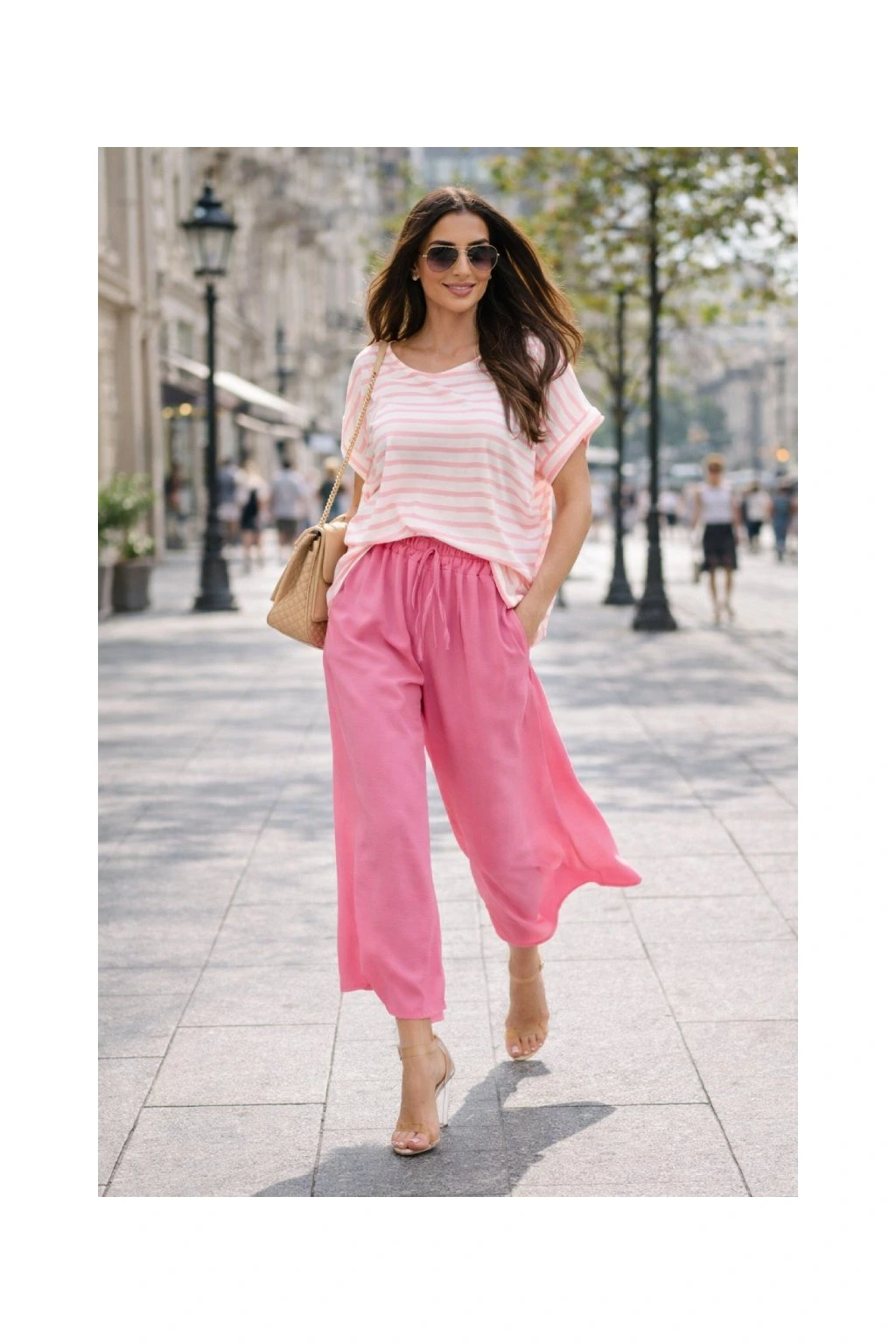 Štýlový a pohodlný dámsky viskózový komplet, ktorý tvorí voľná pruhovaná blúzka s krátkym rukávom a široké nohavice s elastickým pásom. Príjemný, vzdušný materiál s prímesou elastanu zabezpečuje maximálne pohodlie počas jarných a letných dní.