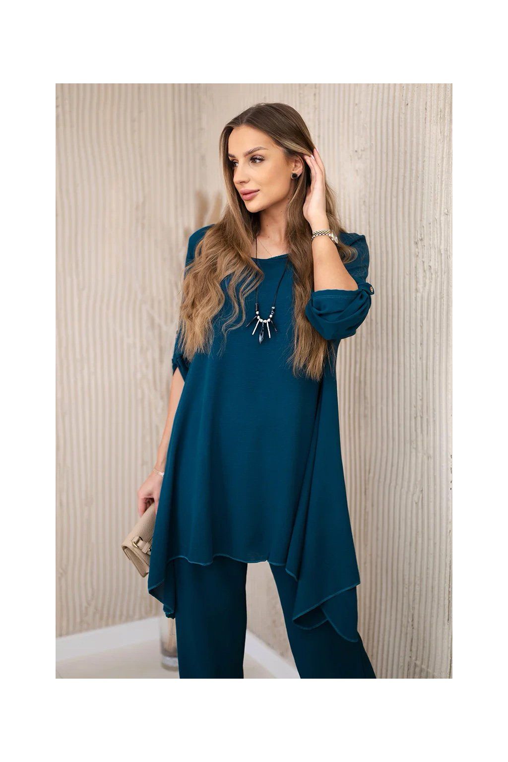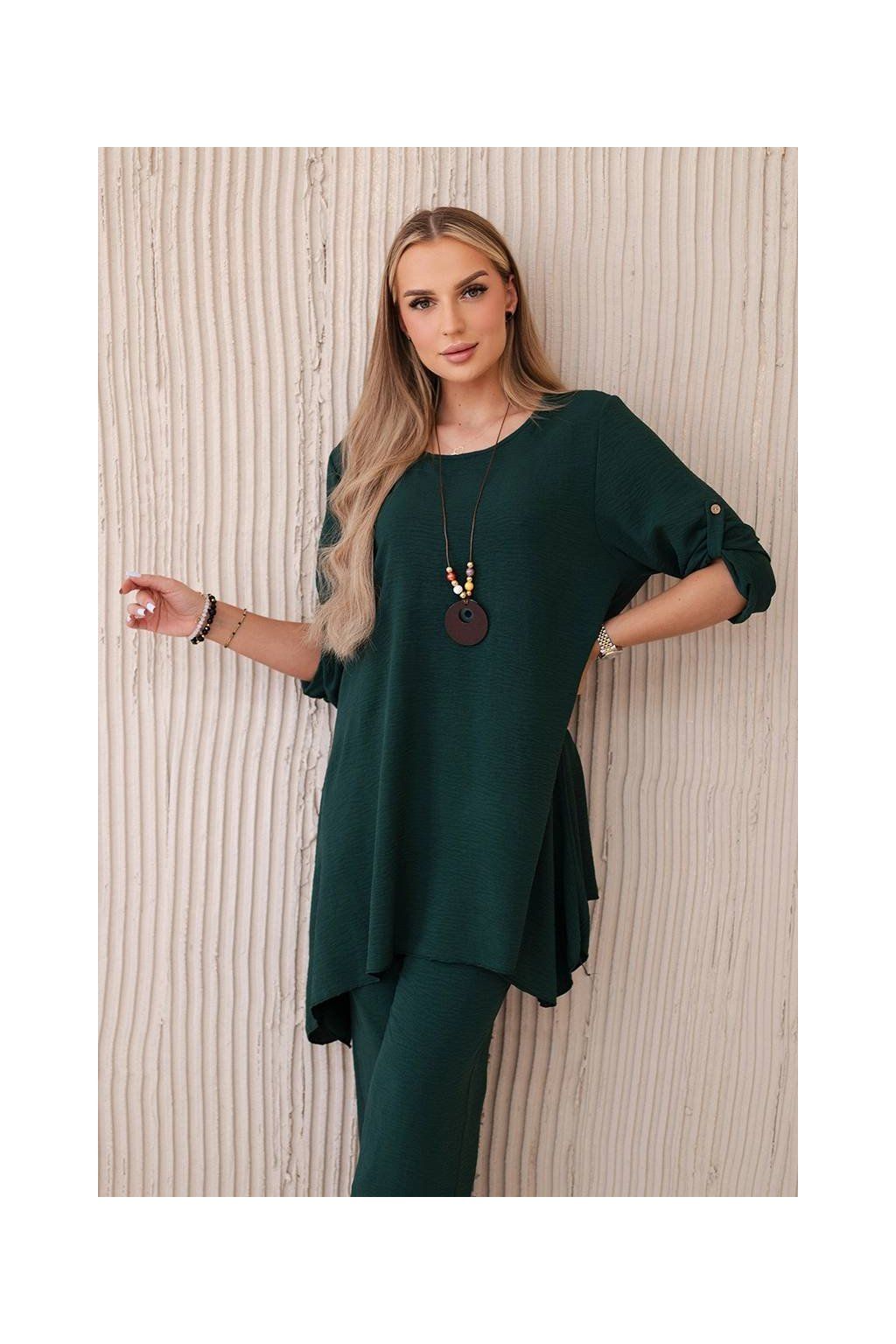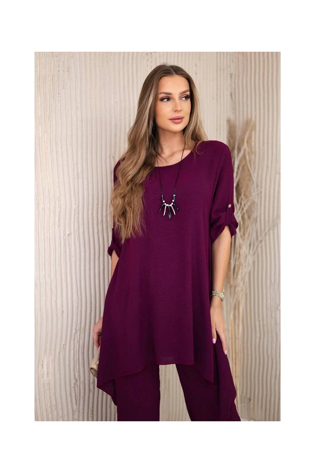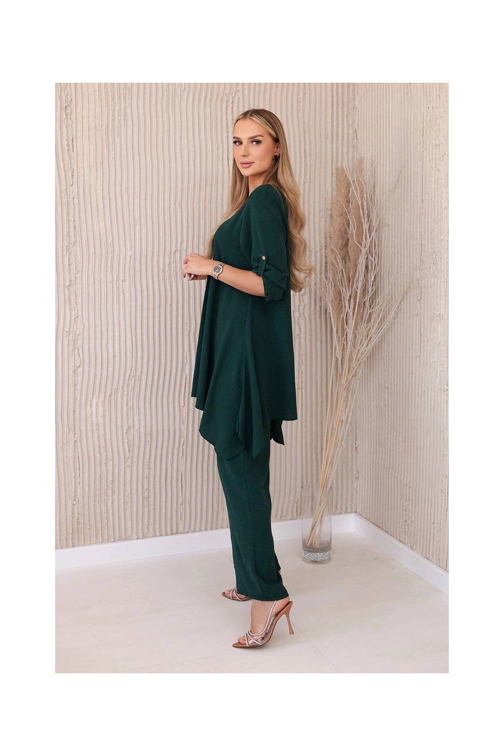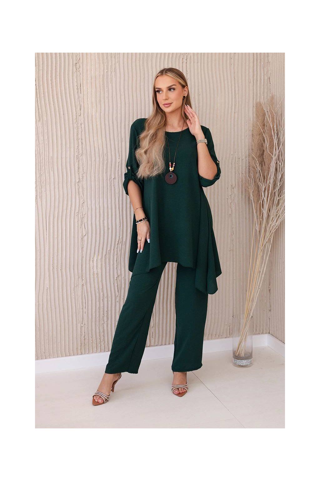Elegantný set je skvelým základom na vytvorenie výrazného a zároveň módneho vzhľadu. Rozviata blúzka dodáva jemnú ženskosť, prívesok v tvare kľúča je navyše očarujúcim detailom, Nohavice sú model so širokými nohavicami a gumou v páse, vďaka ktorej skvele padnú na postavu. Táto sada bude vyzerať skvele ako spoločne, tak samostatne, v kombinácii s ďalšími kúskami z šatníka.