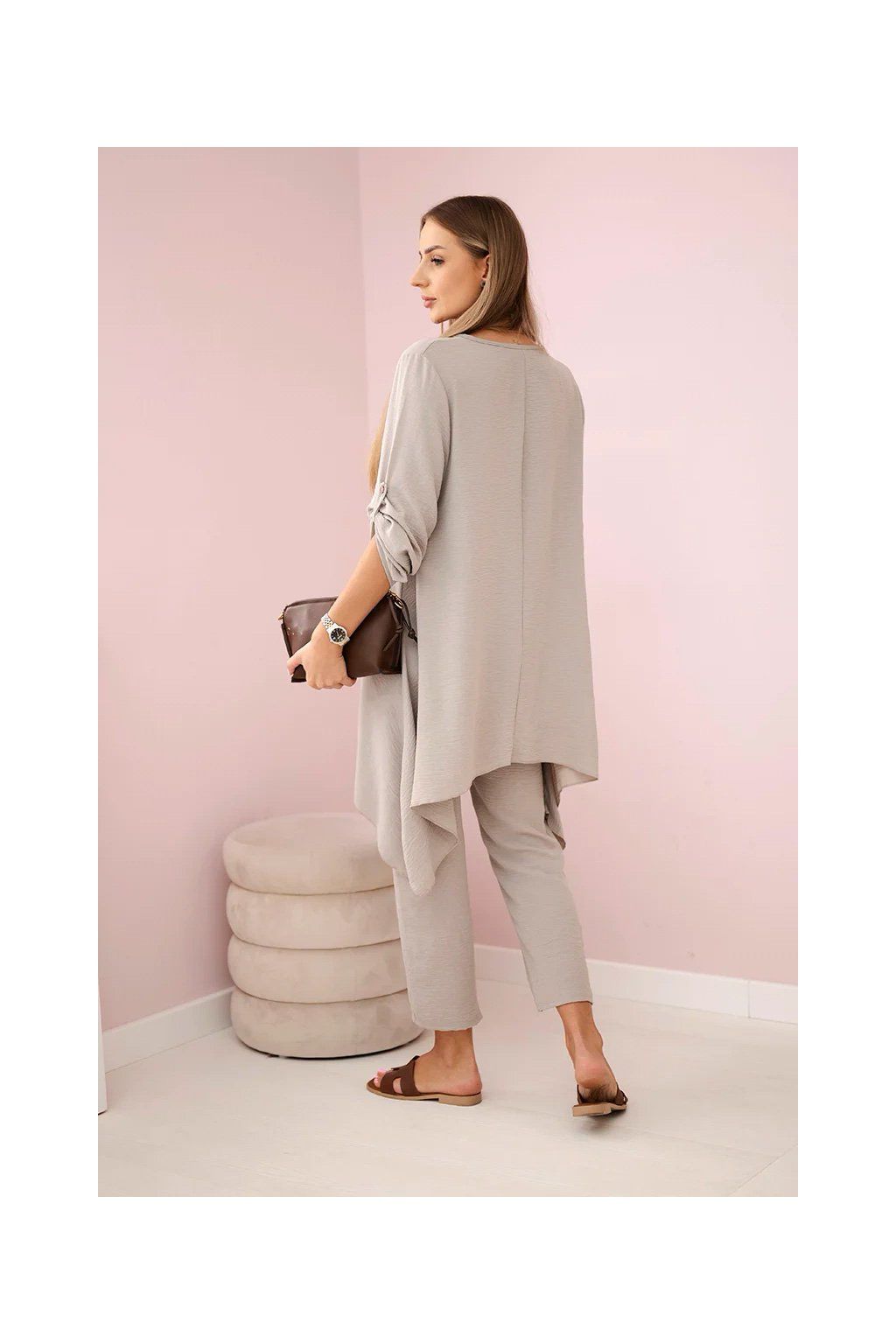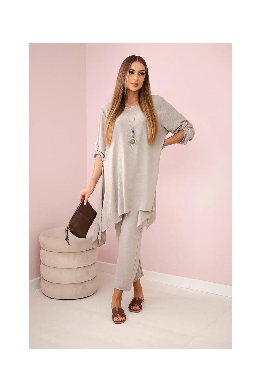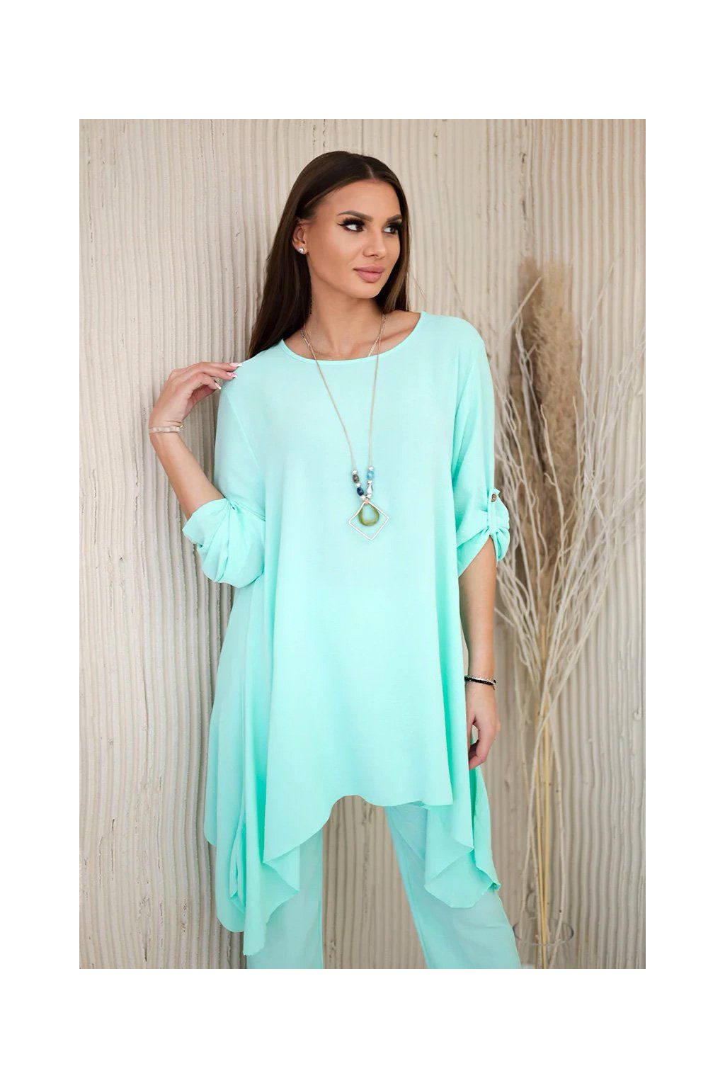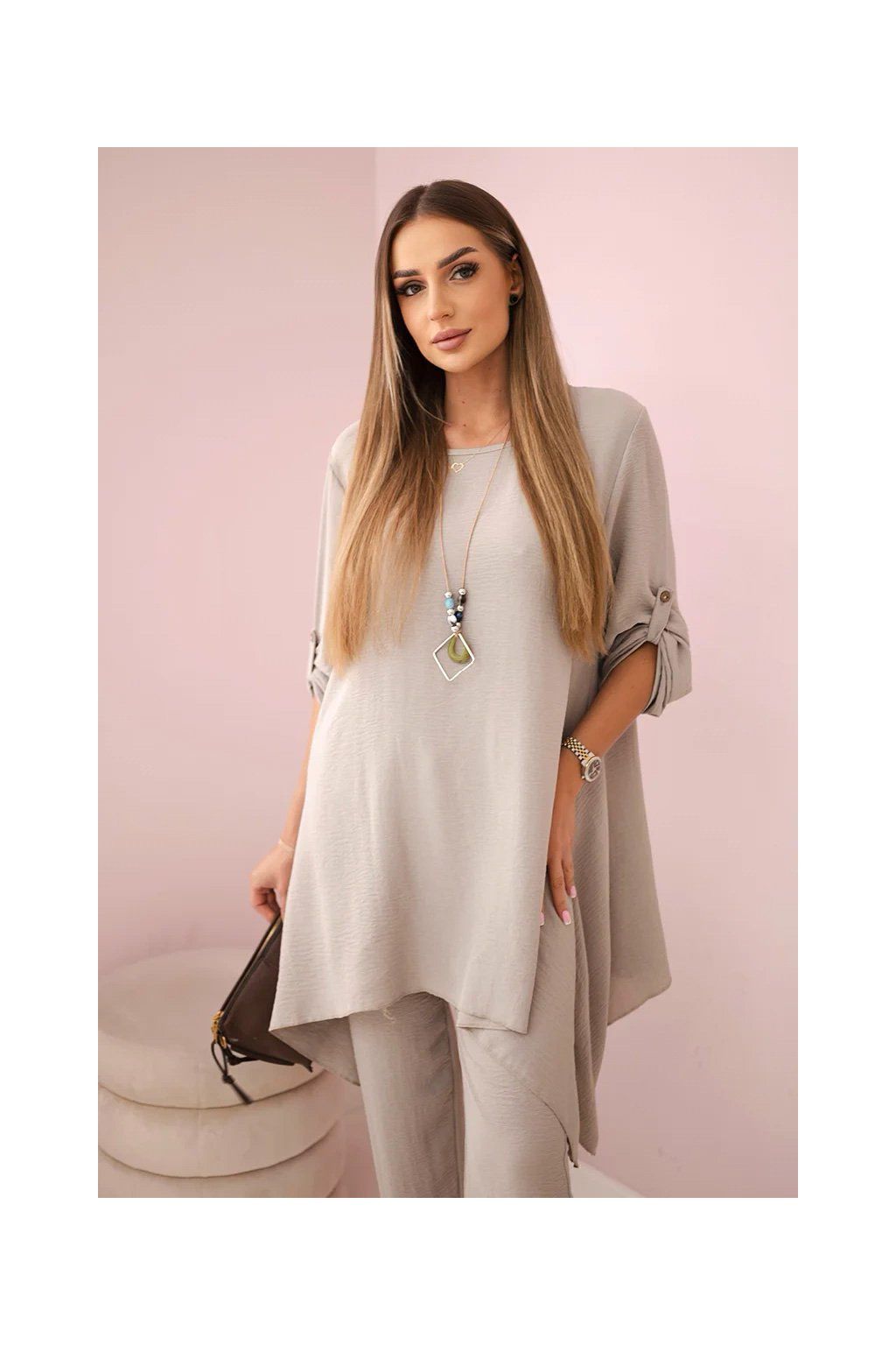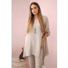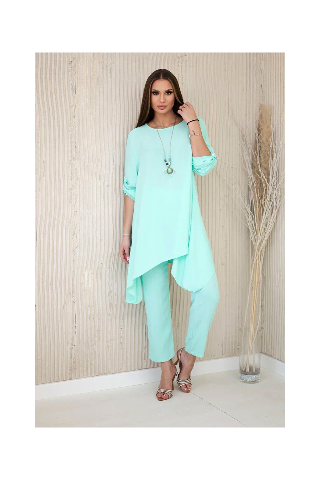 Elegantný set je skvelým základom na vytvorenie výrazného a zároveň módneho vzhľadu. Rozviata blúzka dodáva jemnú ženskosť, prívesok v tvare kľúča je navyše očarujúcim detailom, Nohavice sú model so širokými nohavicami a gumou v páse, vďaka ktorej skvele padnú na postavu. Táto sada bude vyzerať skvele ako spoločne, tak samostatne, v kombinácii s ďalšími kúskami z šatníka.