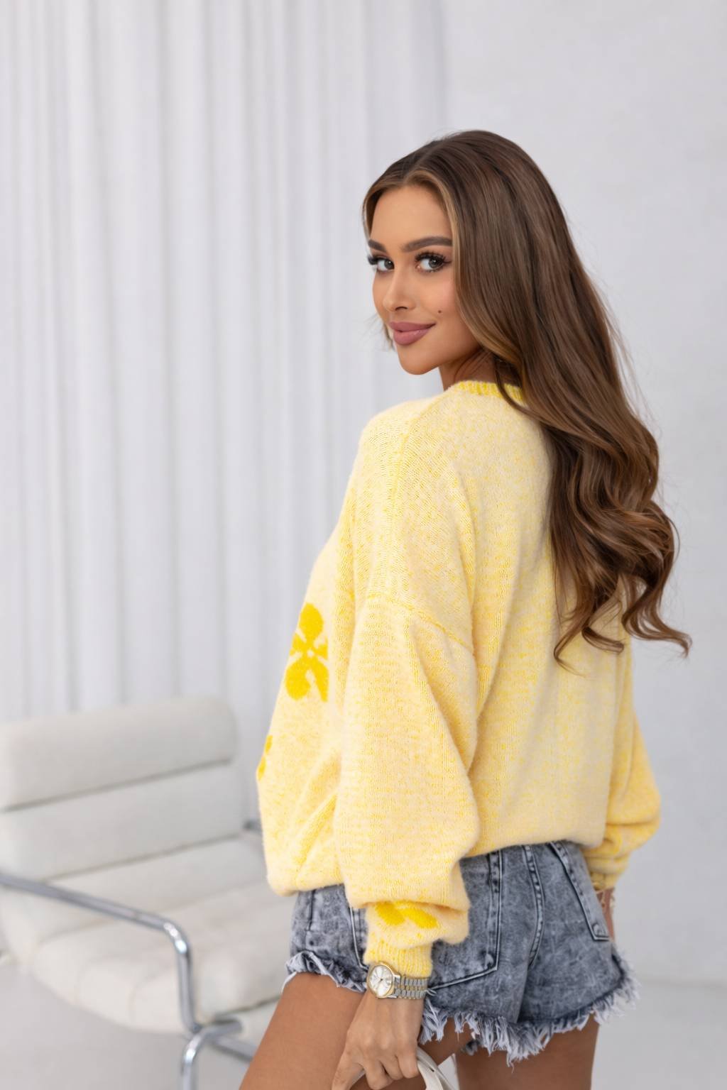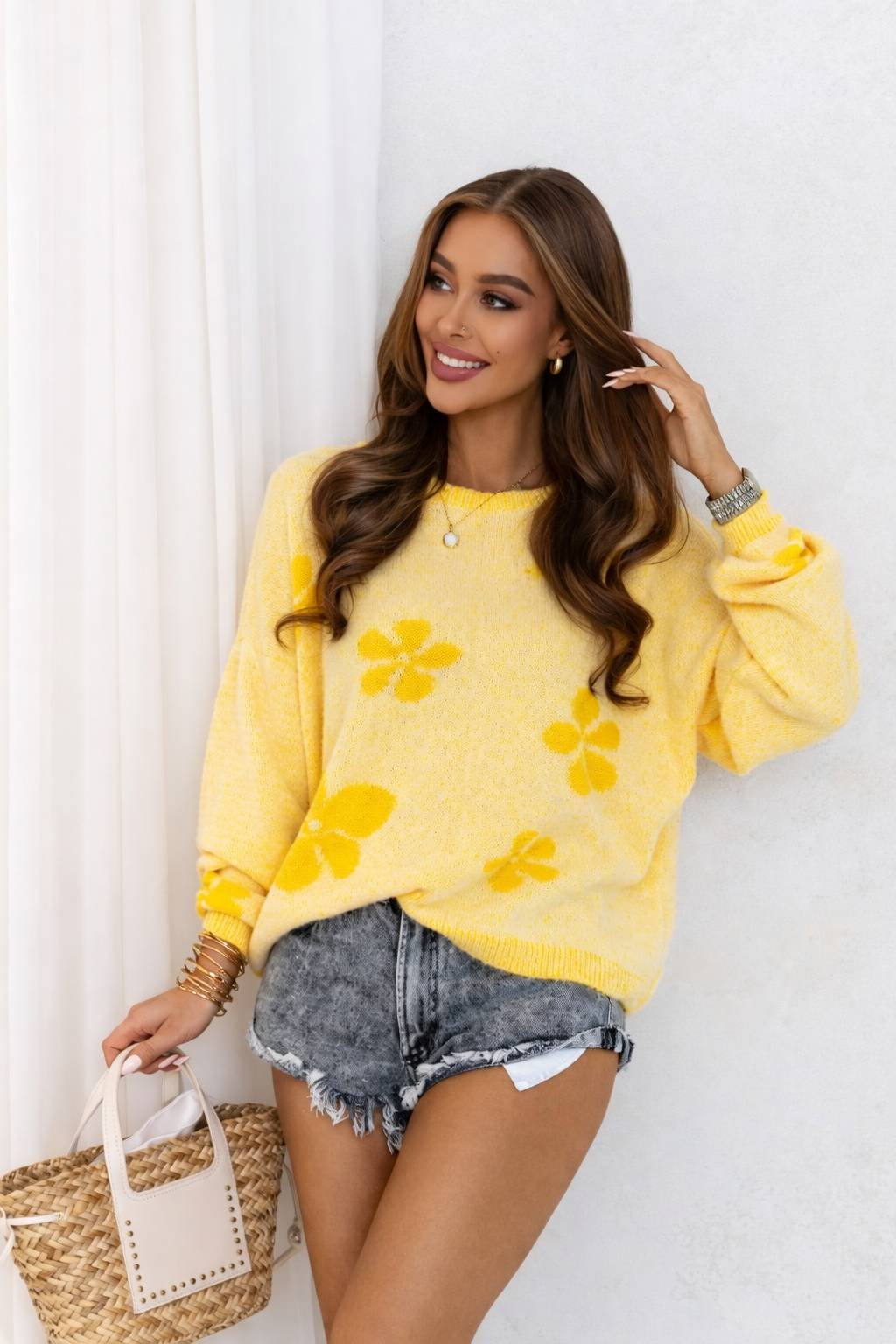 Elegantný a ľahký dámsky jarný sveter v jemných pastelových odtieňoch je perfektnou voľbou na jar aj chladnejšie letné dni. Dekoratívny kvetinový motív dodáva modelu ženskosť a moderný vzhľad.