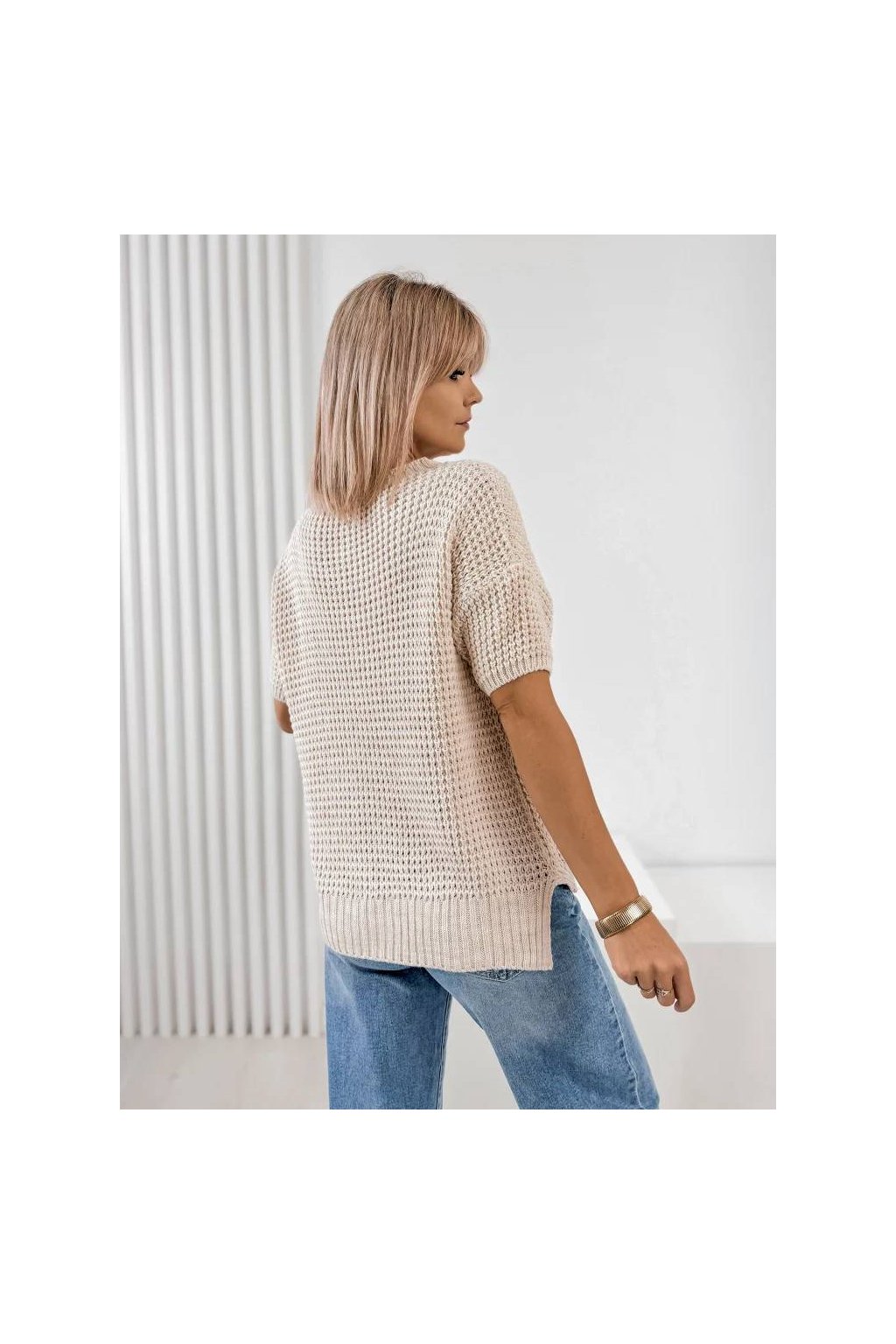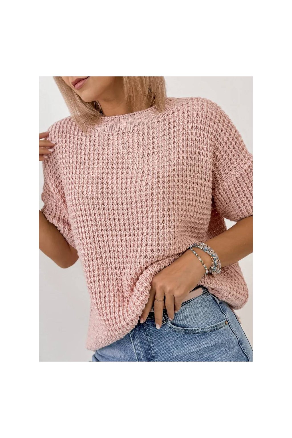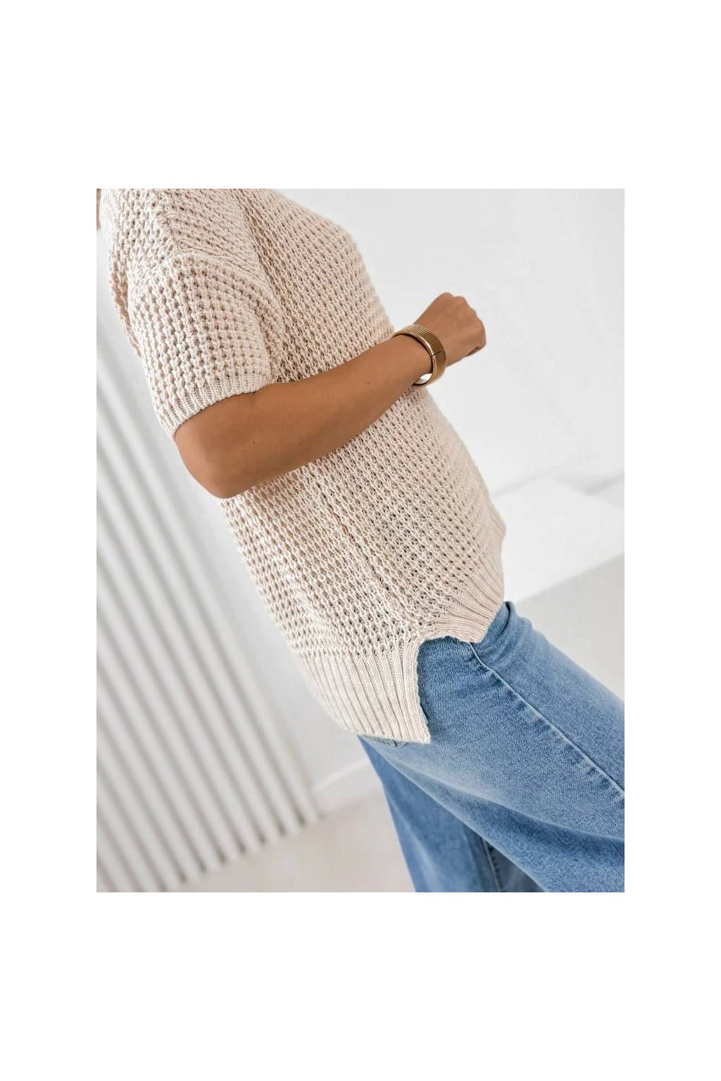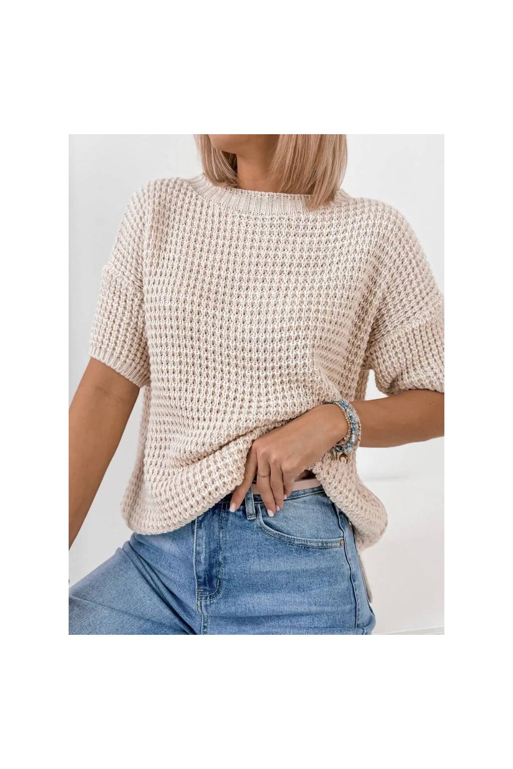 Dámsky pletený sveter s krátkym rukávom je pohodlným a štýlovým kúskom na každý deň. Voľný strih poskytuje maximálny komfort a krásne sa prispôsobí postave. Jemná pletená štruktúra dodáva svetru moderný vzhľad, zatiaľ čo okrúhly výstrih pôsobí nadčasovo a univerzálne.