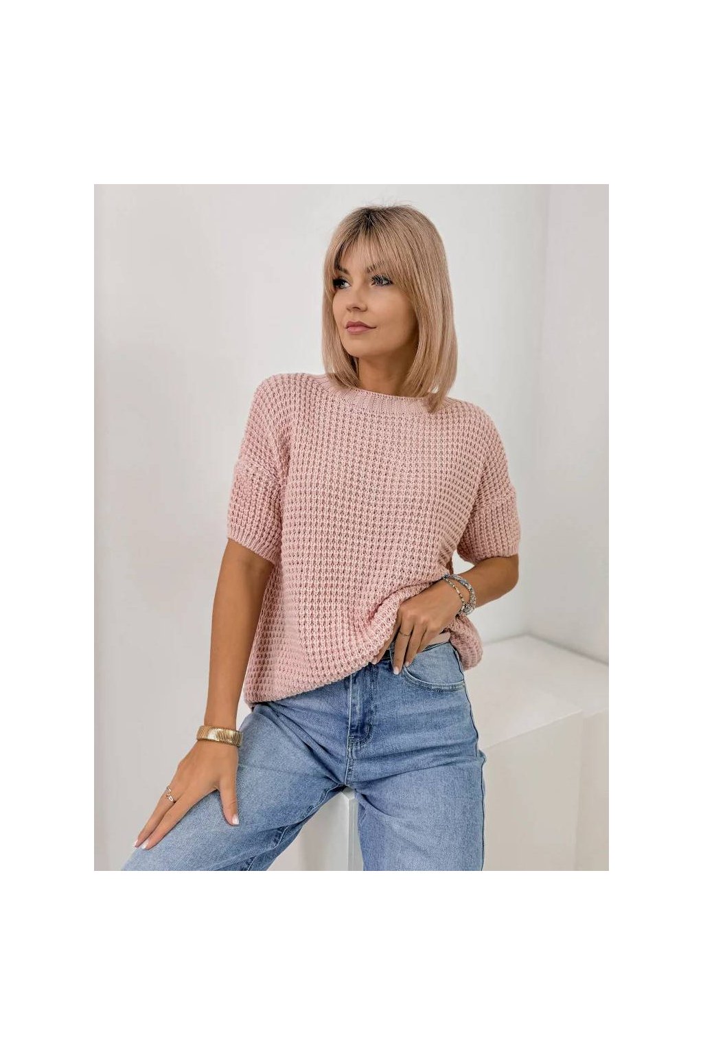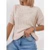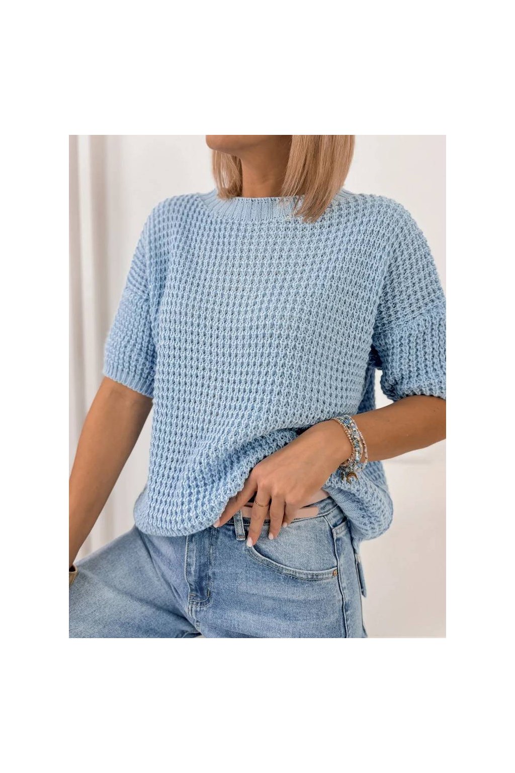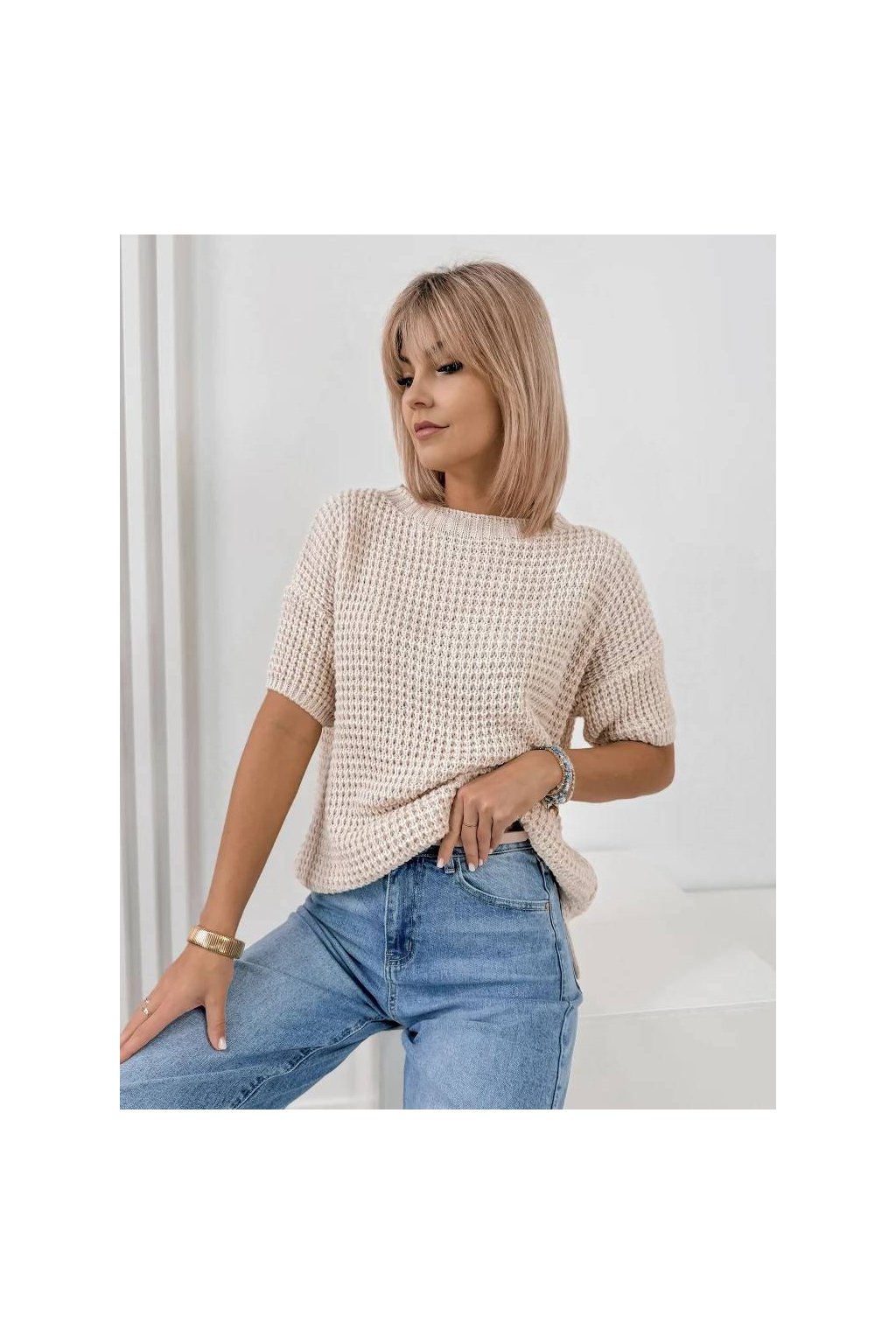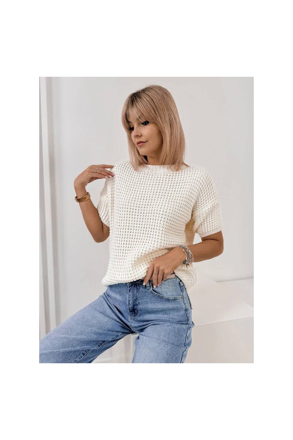 Dámsky pletený sveter s krátkym rukávom je pohodlným a štýlovým kúskom na každý deň. Voľný strih poskytuje maximálny komfort a krásne sa prispôsobí postave. Jemná pletená štruktúra dodáva svetru moderný vzhľad, zatiaľ čo okrúhly výstrih pôsobí nadčasovo a univerzálne.